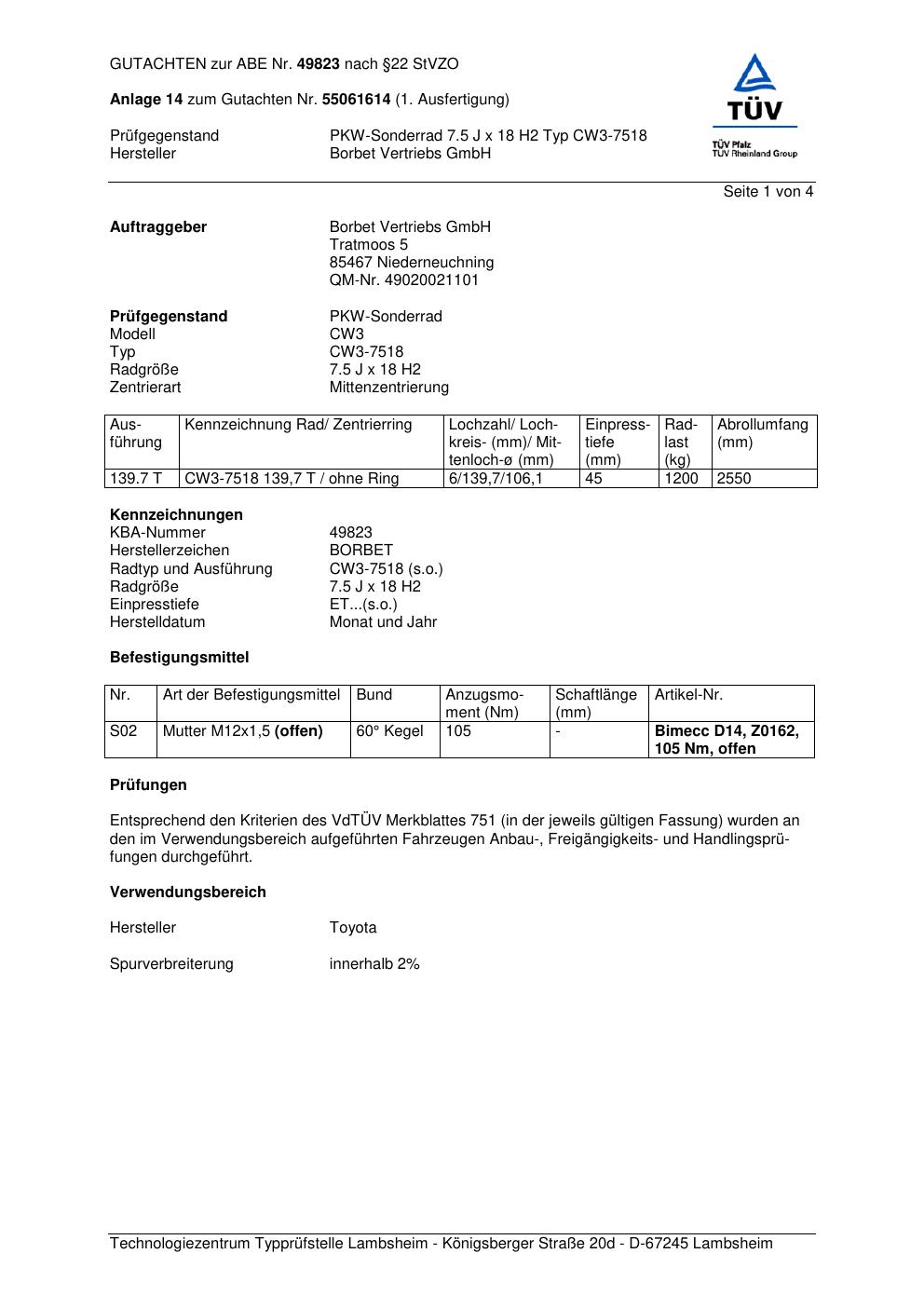 Dieses Gutachten (abe) bezieht sich auf die Alufelge Borbet CW3- 7518 in der Ausführung 7.5Jx18 ET 0, Mittenloch 0 mm (KBA 49823). Im PDF findest du typischerweise zulässige Reifengrößen, Auflagen/Anbauhinweise und – je nach Dokument – Hinweise zur Eintragung.