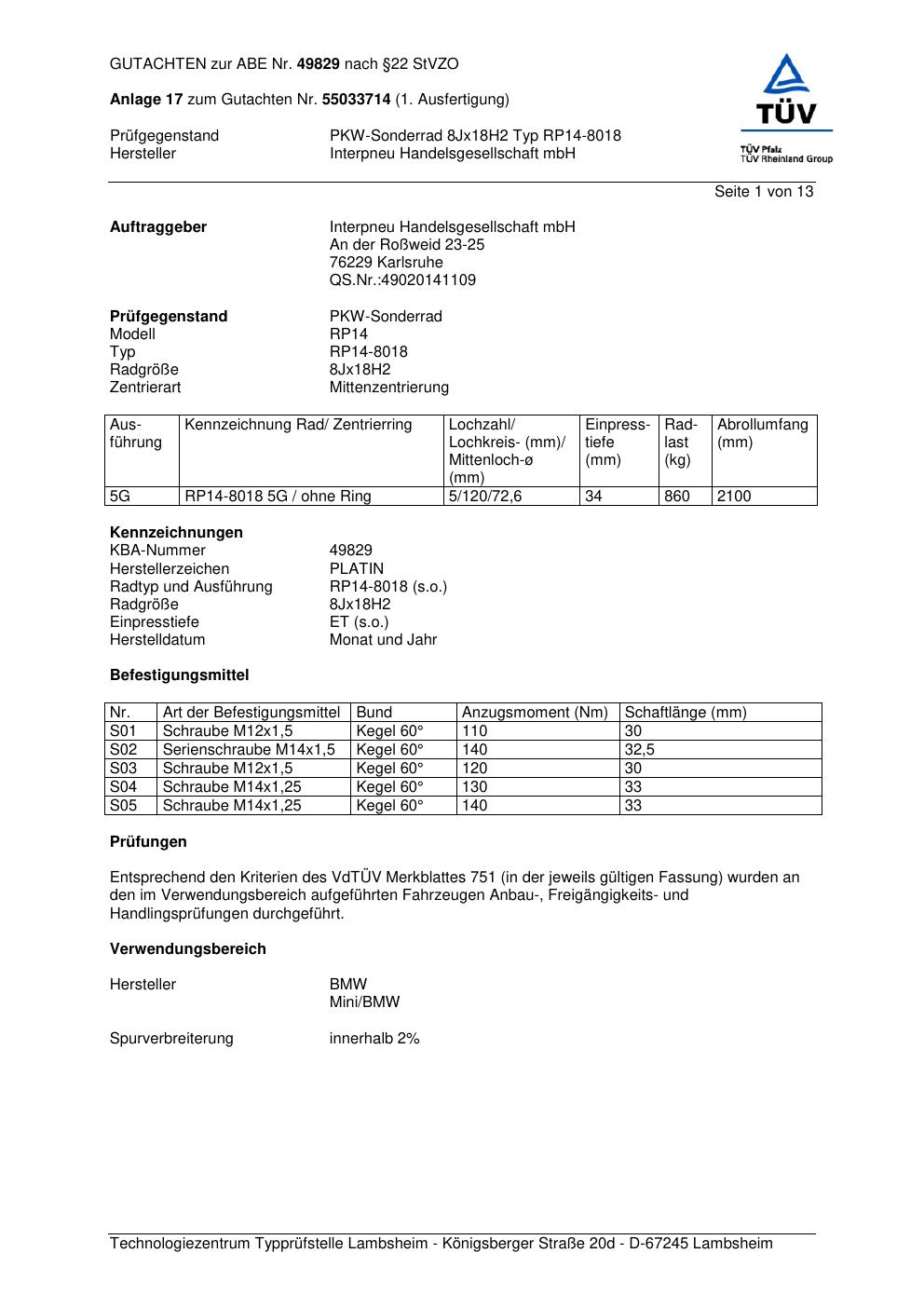 Dieses Gutachten (abe) bezieht sich auf die Alufelge Platin RP14-8018 in der Ausführung 8Jx18 ET 0, Mittenloch 0 mm (KBA 49829). Im PDF findest du typischerweise zulässige Reifengrößen, Auflagen/Anbauhinweise und – je nach Dokument – Hinweise zur Eintragung.