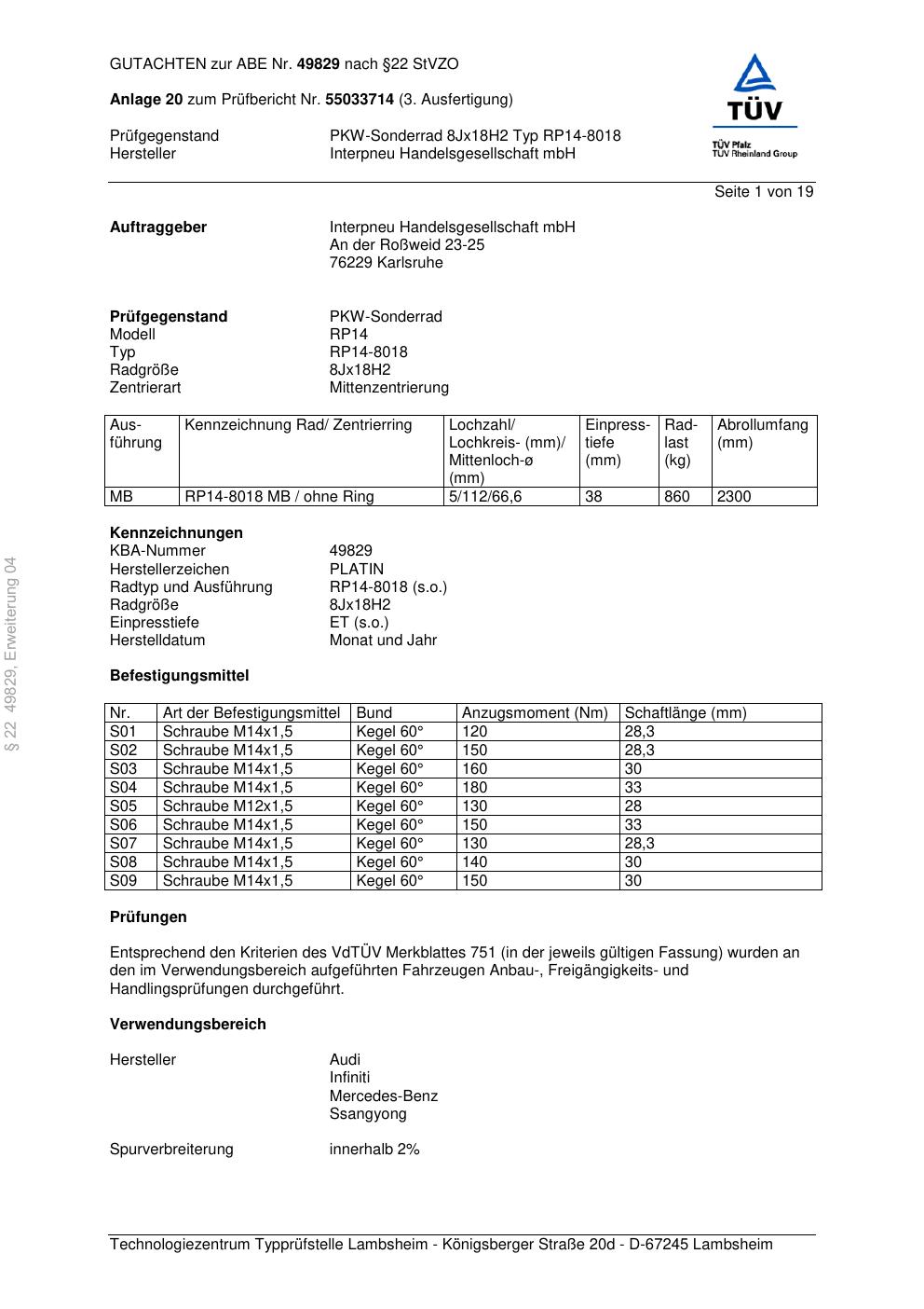 Dieses Gutachten (abe) bezieht sich auf die Alufelge Platin RP14-8018 in der Ausführung 8Jx18 ET 0, Mittenloch 0 mm (KBA 49829). Im PDF findest du typischerweise zulässige Reifengrößen, Auflagen/Anbauhinweise und – je nach Dokument – Hinweise zur Eintragung.