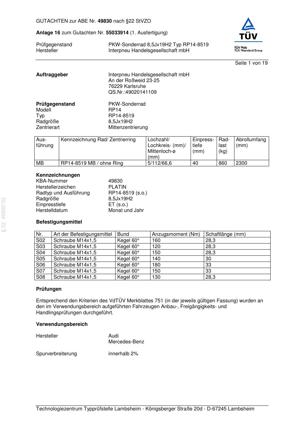 Dieses Gutachten (abe) bezieht sich auf die Alufelge Platin RP14-851 9 in der Ausführung 8.5Jx19 ET 0, Mittenloch 0 mm (KBA 49830). Im PDF findest du typischerweise zulässige Reifengrößen, Auflagen/Anbauhinweise und – je nach Dokument – Hinweise zur Eintragung.