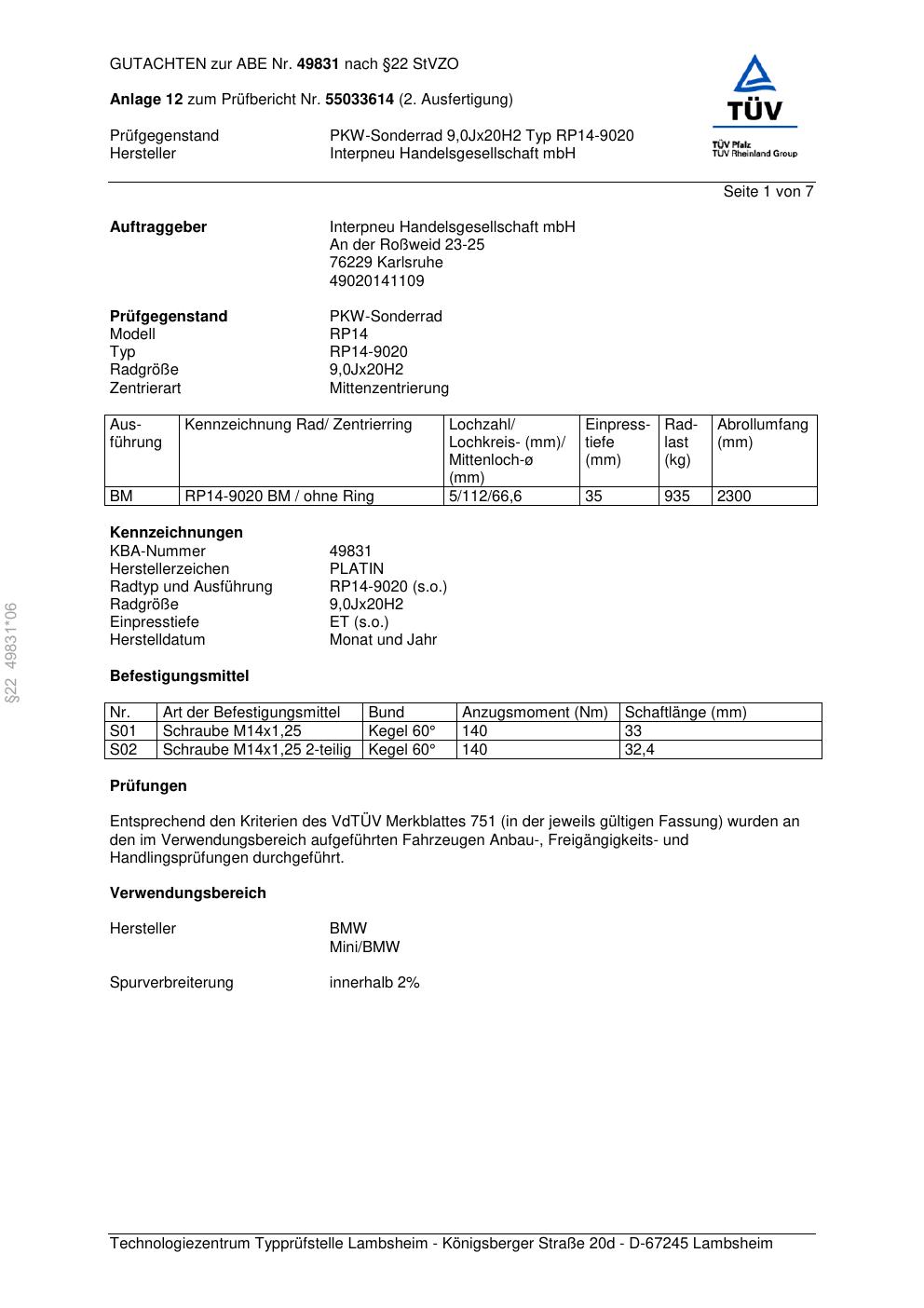 Dieses Gutachten (abe) bezieht sich auf die Alufelge Platin RP14-902 0 in der Ausführung 9Jx2 ET 0, Mittenloch 0 mm (KBA 49831). Im PDF findest du typischerweise zulässige Reifengrößen, Auflagen/Anbauhinweise und – je nach Dokument – Hinweise zur Eintragung.