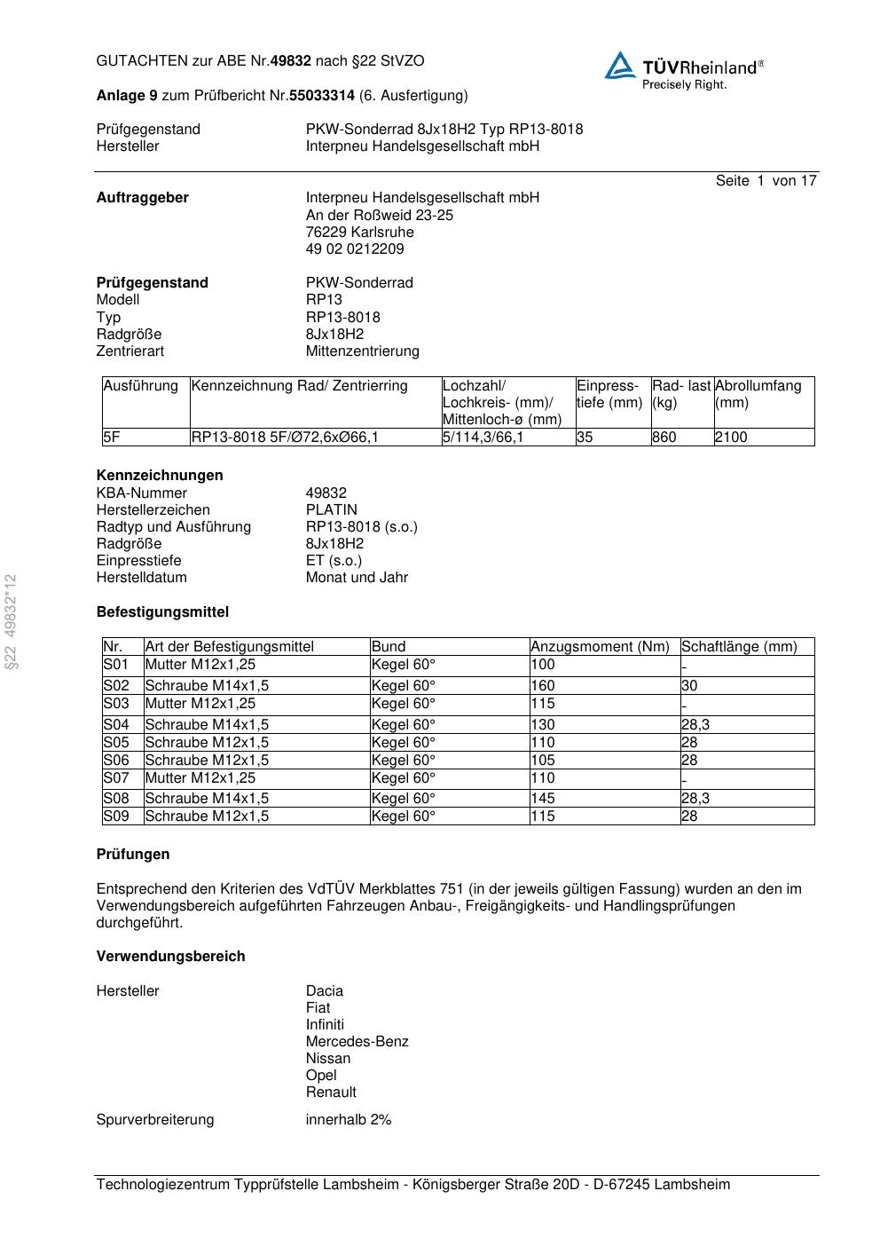 • Stimmt die KBA-Nummer auf der Felge mit diesem Dokument überein?