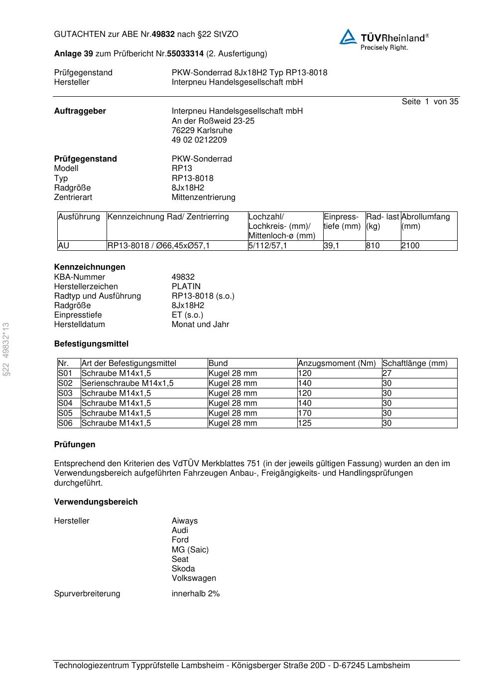 • Stimmt die KBA-Nummer auf der Felge mit diesem Dokument überein?