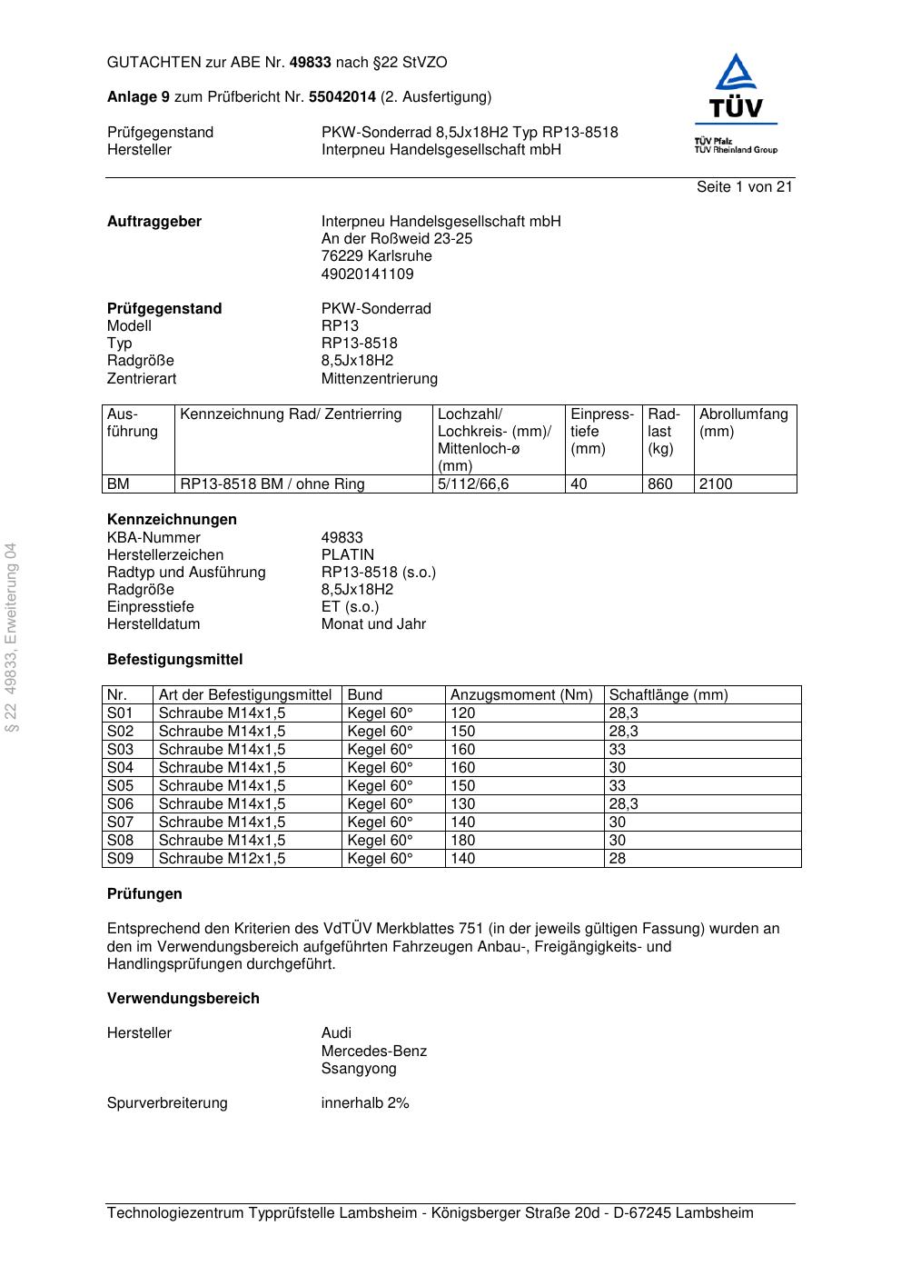 Dieses Gutachten (abe) bezieht sich auf die Alufelge Platin RP13-851 8 in der Ausführung 8.5Jx18 ET 0, Mittenloch 0 mm (KBA 49833). Im PDF findest du typischerweise zulässige Reifengrößen, Auflagen/Anbauhinweise und – je nach Dokument – Hinweise zur Eintragung.