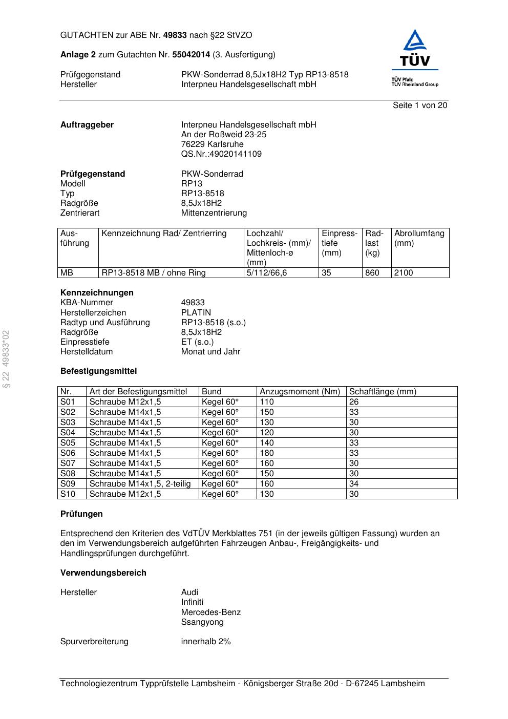Dieses Gutachten (abe) bezieht sich auf die Alufelge Platin RP13-851 8 in der Ausführung 8.5Jx18 ET 0, Mittenloch 0 mm (KBA 49833). Im PDF findest du typischerweise zulässige Reifengrößen, Auflagen/Anbauhinweise und – je nach Dokument – Hinweise zur Eintragung.