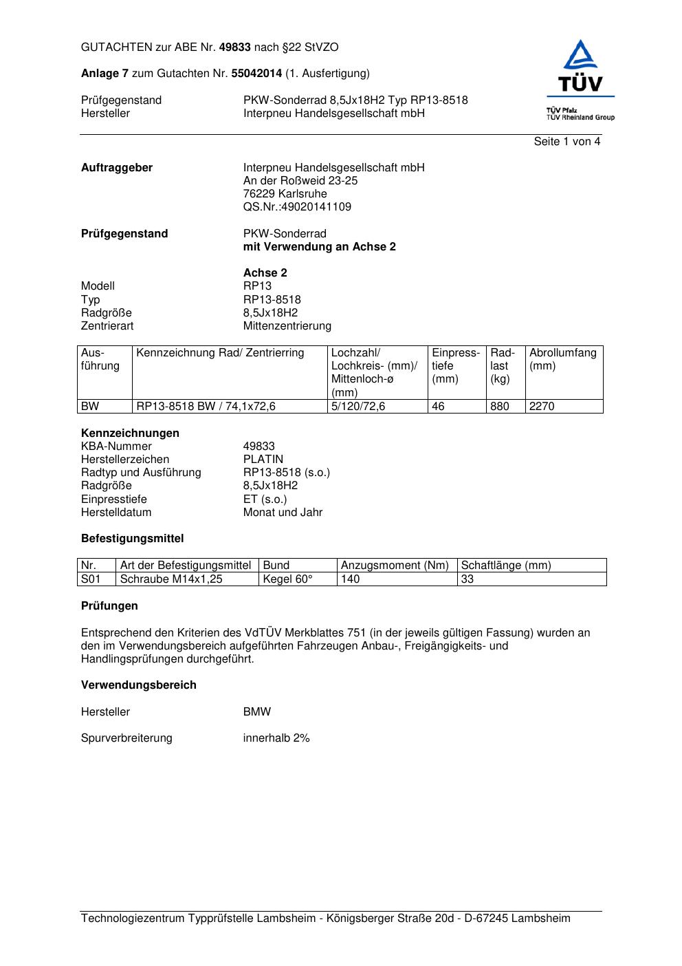 Dieses Gutachten (abe) bezieht sich auf die Alufelge Platin RP13-851 8 in der Ausführung 8.5Jx18 ET 0, Mittenloch 0 mm (KBA 49833). Im PDF findest du typischerweise zulässige Reifengrößen, Auflagen/Anbauhinweise und – je nach Dokument – Hinweise zur Eintragung.