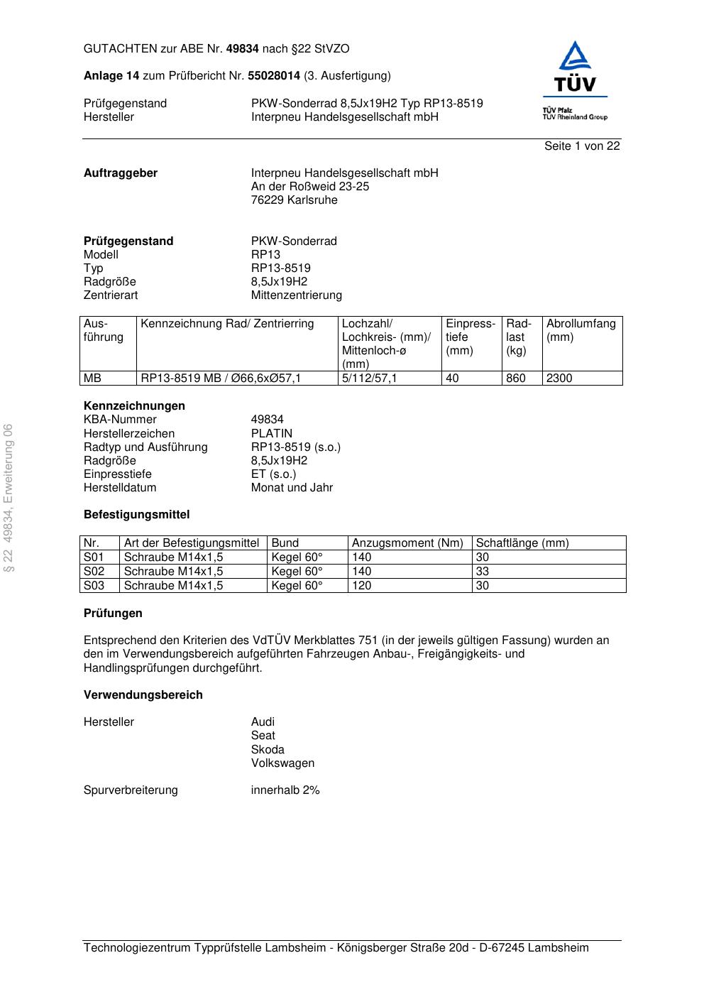 Dieses Gutachten (abe) bezieht sich auf die Alufelge Platin RP13-851 9 in der Ausführung 8.5Jx19 ET 0, Mittenloch 0 mm (KBA 49834). Im PDF findest du typischerweise zulässige Reifengrößen, Auflagen/Anbauhinweise und – je nach Dokument – Hinweise zur Eintragung.