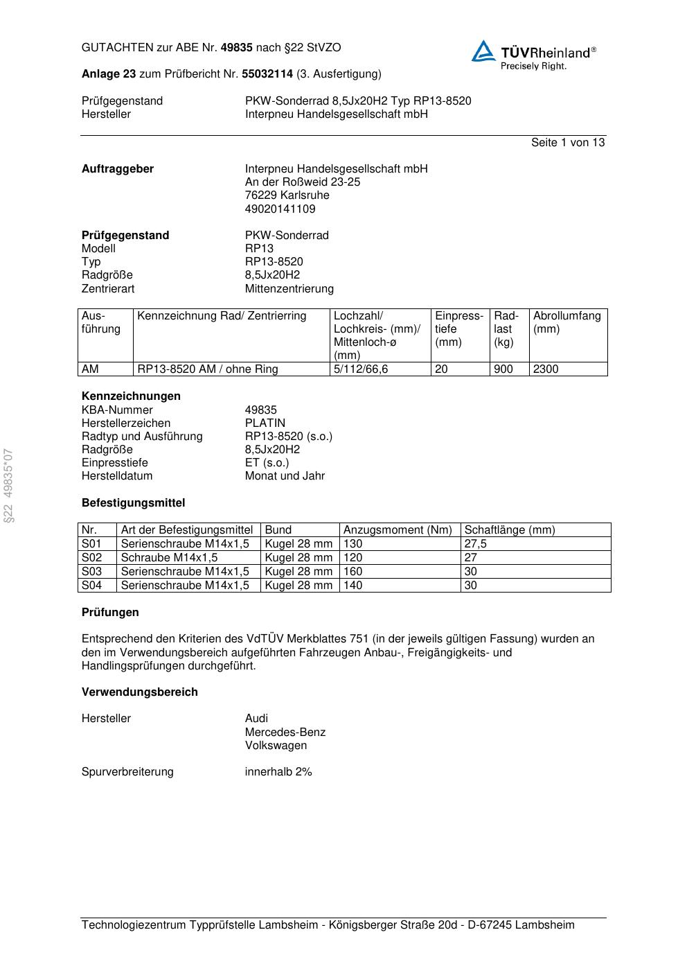 • Stimmt die KBA-Nummer auf der Felge mit diesem Dokument überein?