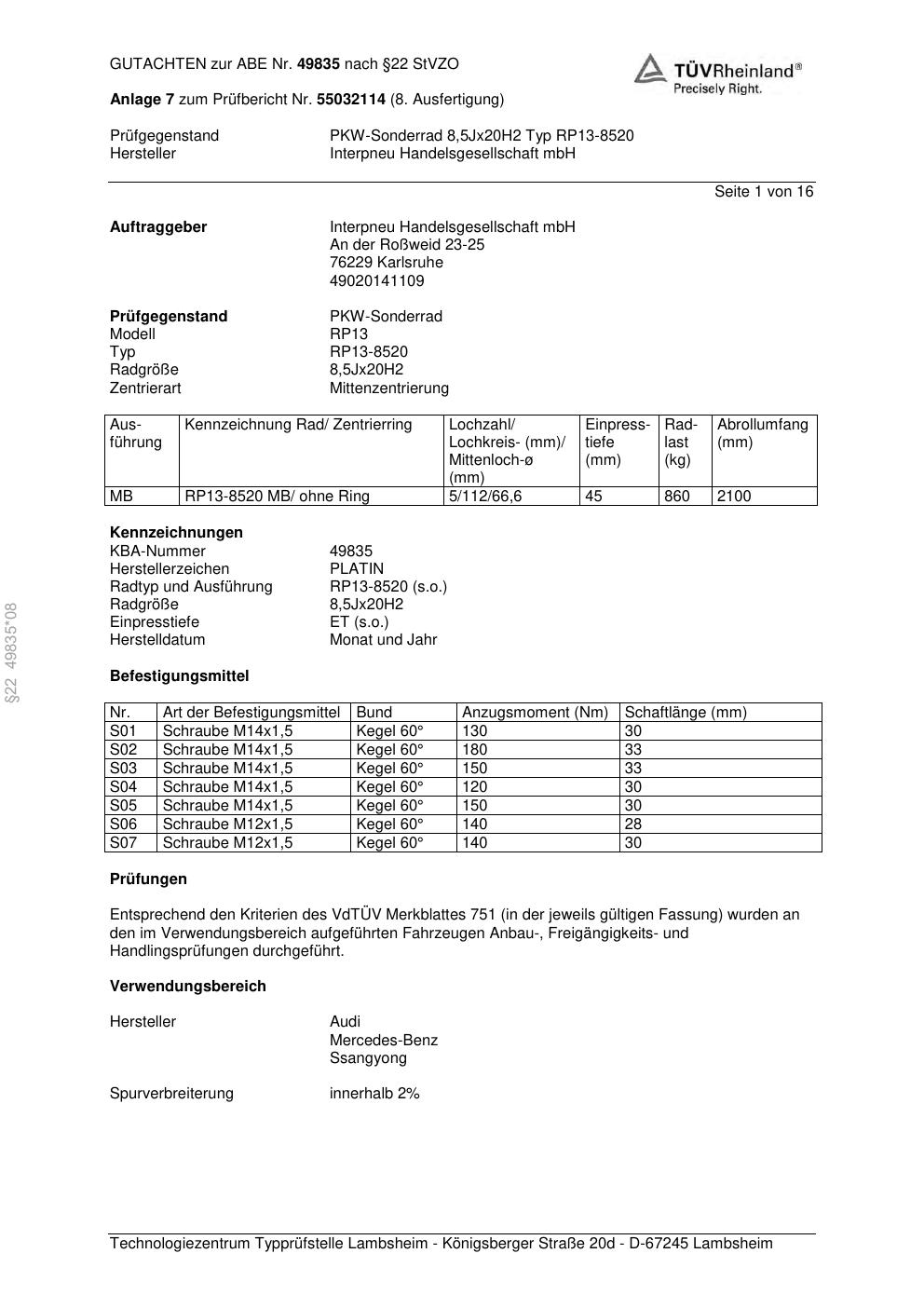 • Stimmt die KBA-Nummer auf der Felge mit diesem Dokument überein?