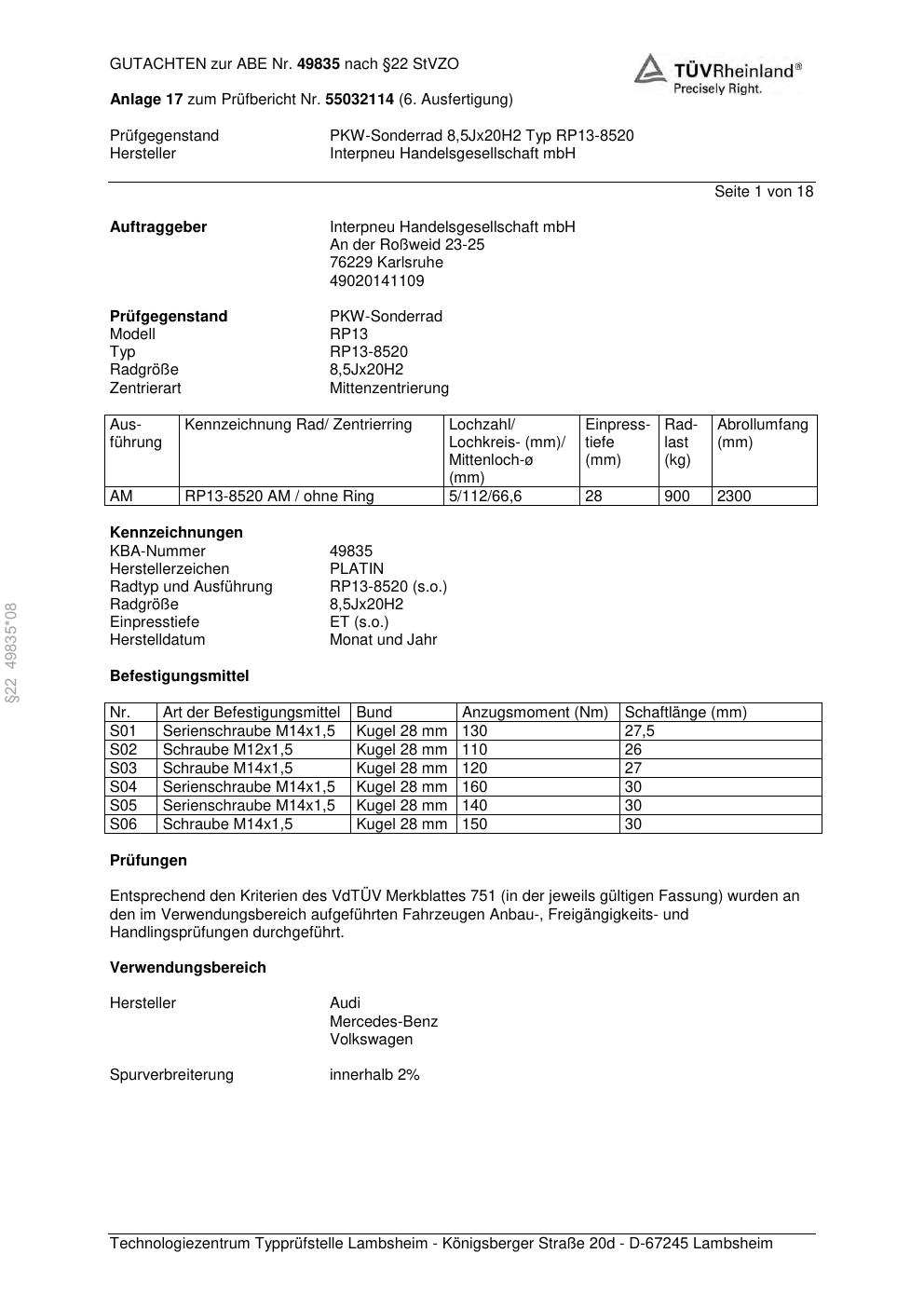 • Stimmt die KBA-Nummer auf der Felge mit diesem Dokument überein?
