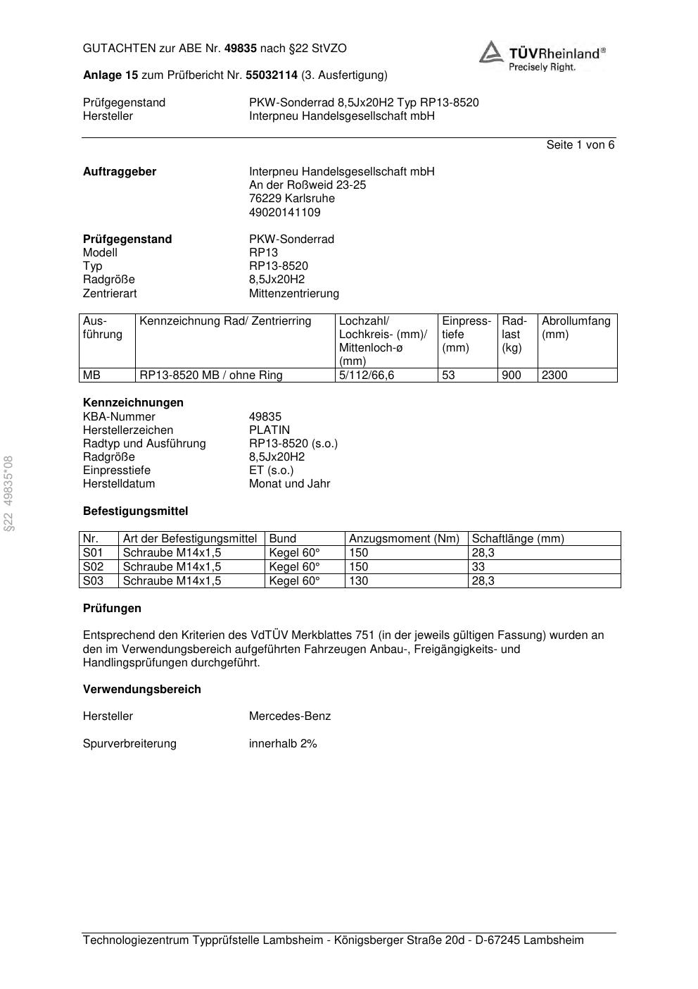 • Stimmt die KBA-Nummer auf der Felge mit diesem Dokument überein?