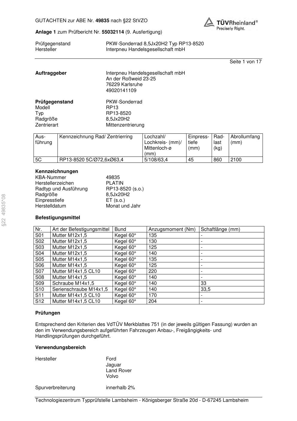 • Stimmt die KBA-Nummer auf der Felge mit diesem Dokument überein?