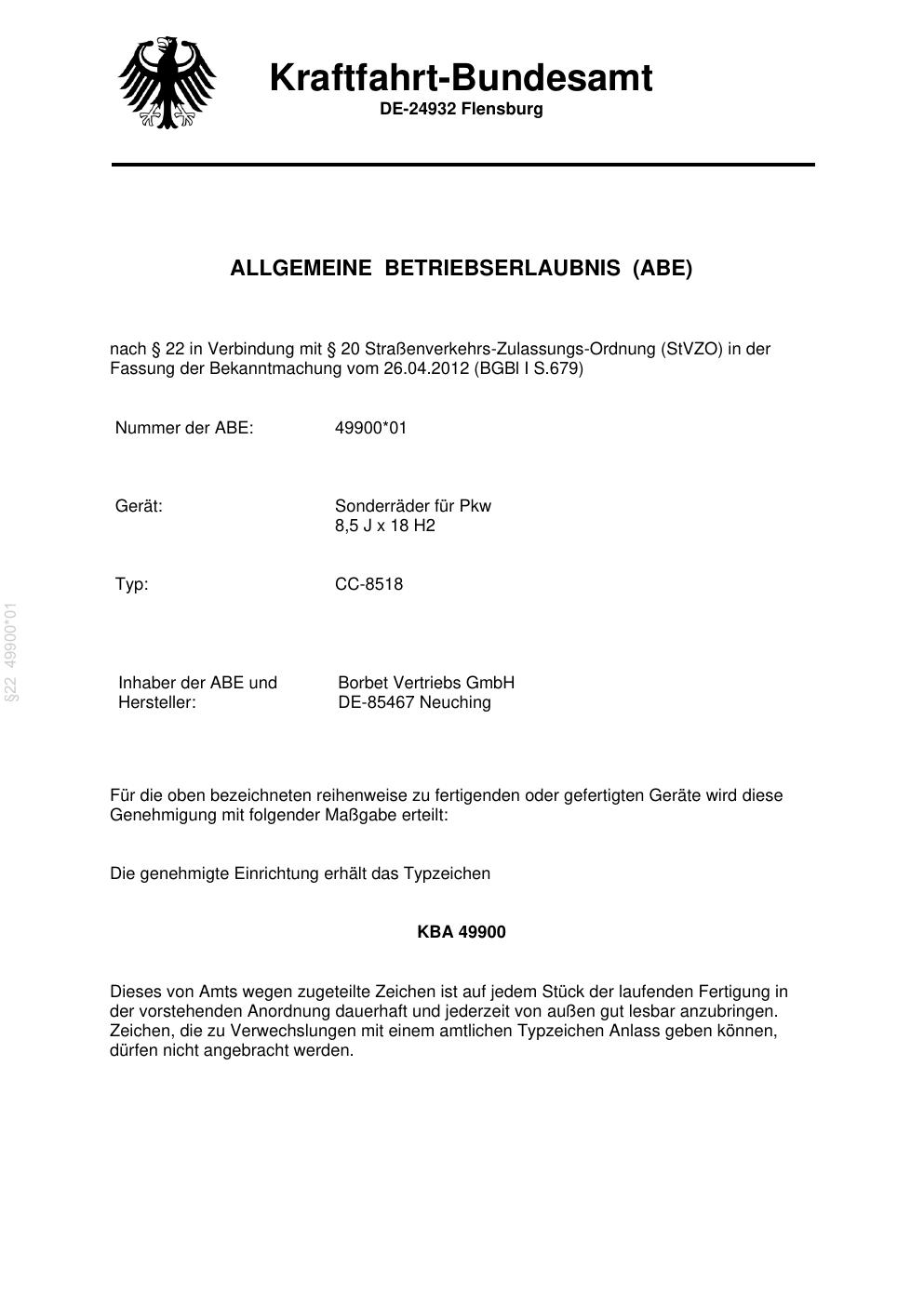 Dieses Gutachten (abe) bezieht sich auf die Alufelge Borbet CC-8518 in der Ausführung 8.5Jx18 ET 0, Mittenloch 0 mm (KBA 49900). Im PDF findest du typischerweise zulässige Reifengrößen, Auflagen/Anbauhinweise und – je nach Dokument – Hinweise zur Eintragung.
