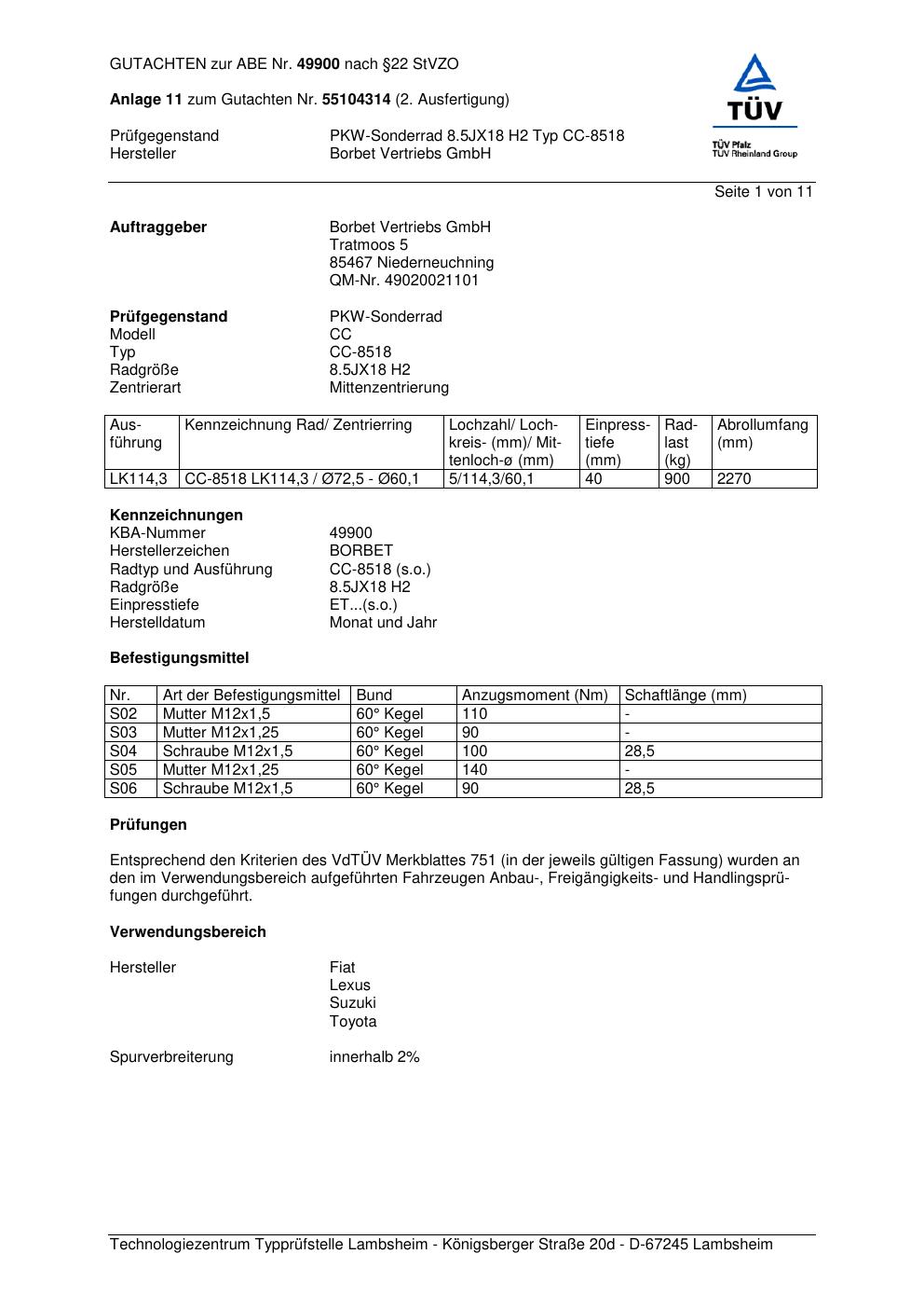 Dieses Gutachten (abe) bezieht sich auf die Alufelge Borbet CC-8518 in der Ausführung 8.5Jx18 ET 0, Mittenloch 0 mm (KBA 49900). Im PDF findest du typischerweise zulässige Reifengrößen, Auflagen/Anbauhinweise und – je nach Dokument – Hinweise zur Eintragung.