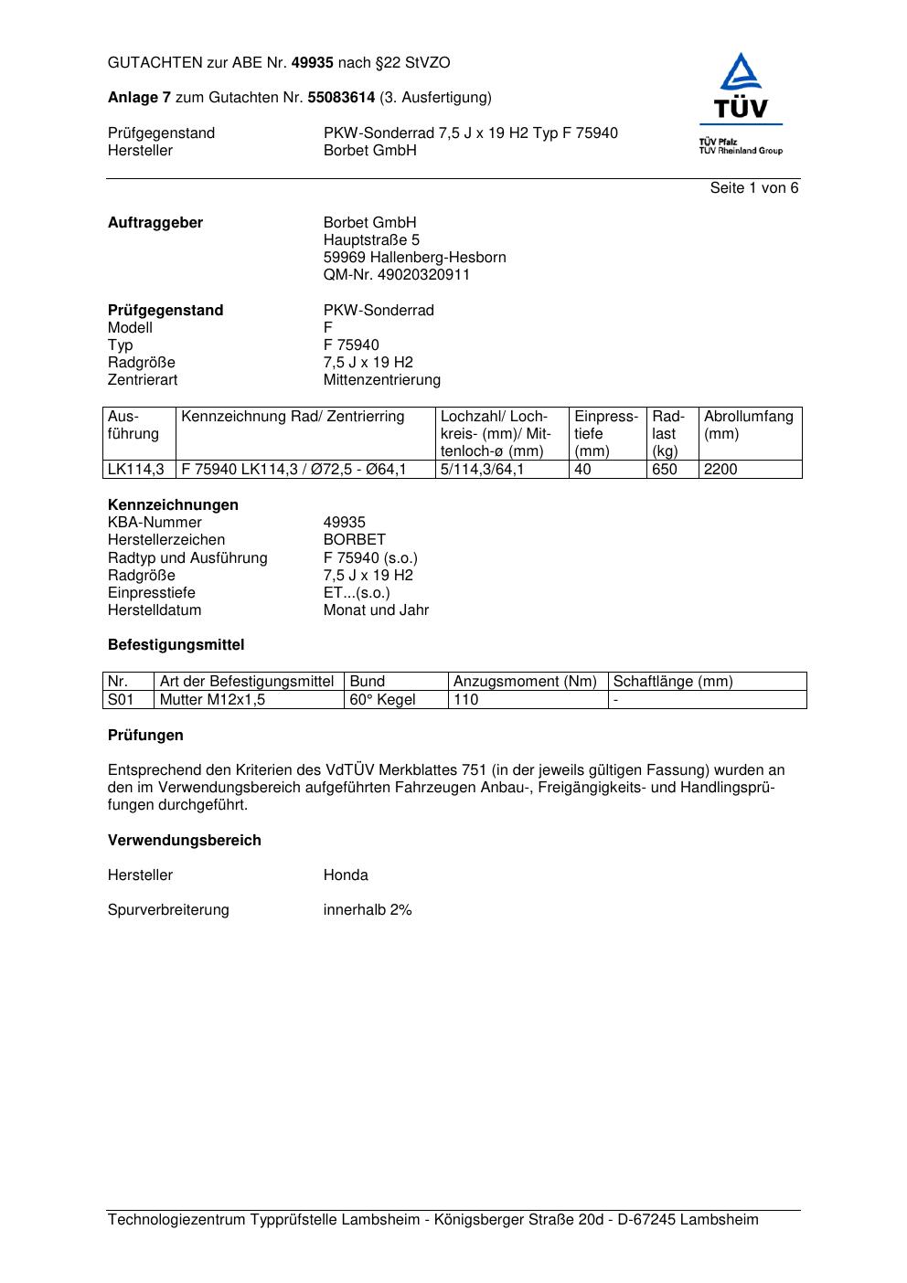 Dieses Gutachten (abe) bezieht sich auf die Alufelge Borbet F 75 940 in der Ausführung 7.5Jx19 ET 0, Mittenloch 0 mm (KBA 49935). Im PDF findest du typischerweise zulässige Reifengrößen, Auflagen/Anbauhinweise und – je nach Dokument – Hinweise zur Eintragung.