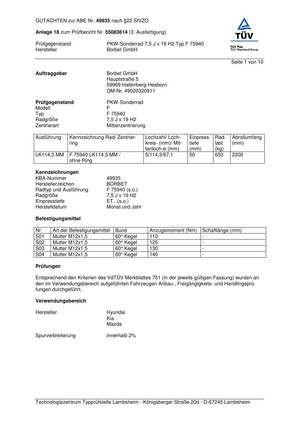 Dieses Gutachten (abe) bezieht sich auf die Alufelge Borbet F 75 940 in der Ausführung 7.5Jx19 ET 0, Mittenloch 0 mm (KBA 49935). Im PDF findest du typischerweise zulässige Reifengrößen, Auflagen/Anbauhinweise und – je nach Dokument – Hinweise zur Eintragung.