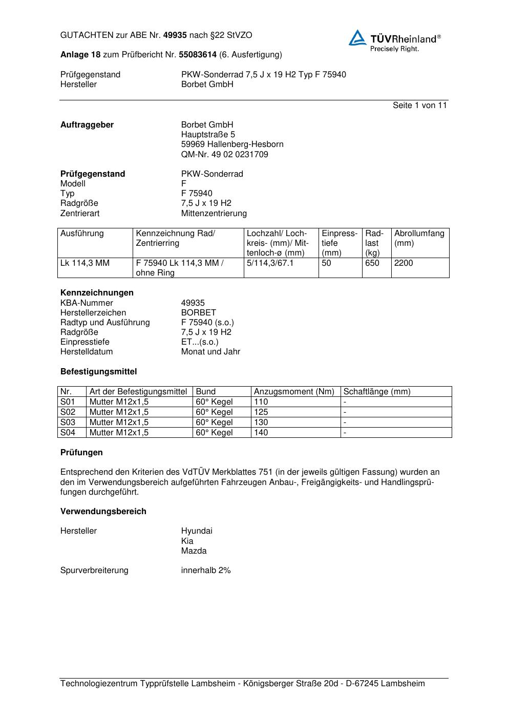 Dieses Gutachten (abe) bezieht sich auf die Alufelge Borbet F 75 940 in der Ausführung 7.5Jx19 ET 0, Mittenloch 0 mm (KBA 49935). Im PDF findest du typischerweise zulässige Reifengrößen, Auflagen/Anbauhinweise und – je nach Dokument – Hinweise zur Eintragung.