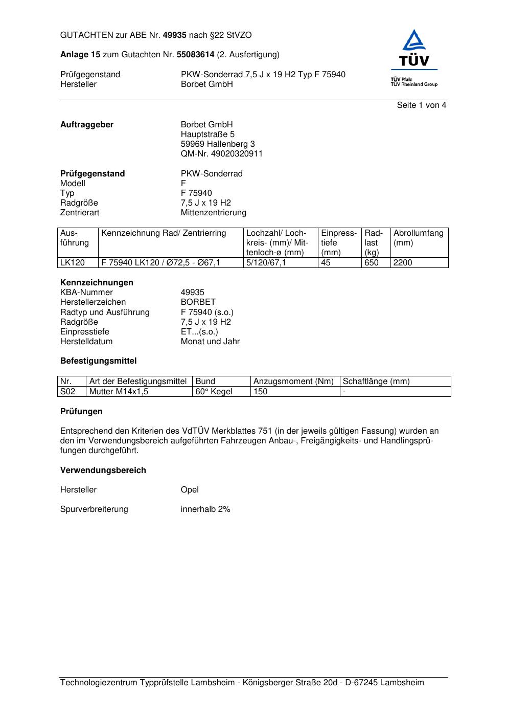 Dieses Gutachten (abe) bezieht sich auf die Alufelge Borbet F 75 940 in der Ausführung 7.5Jx19 ET 0, Mittenloch 0 mm (KBA 49935). Im PDF findest du typischerweise zulässige Reifengrößen, Auflagen/Anbauhinweise und – je nach Dokument – Hinweise zur Eintragung.