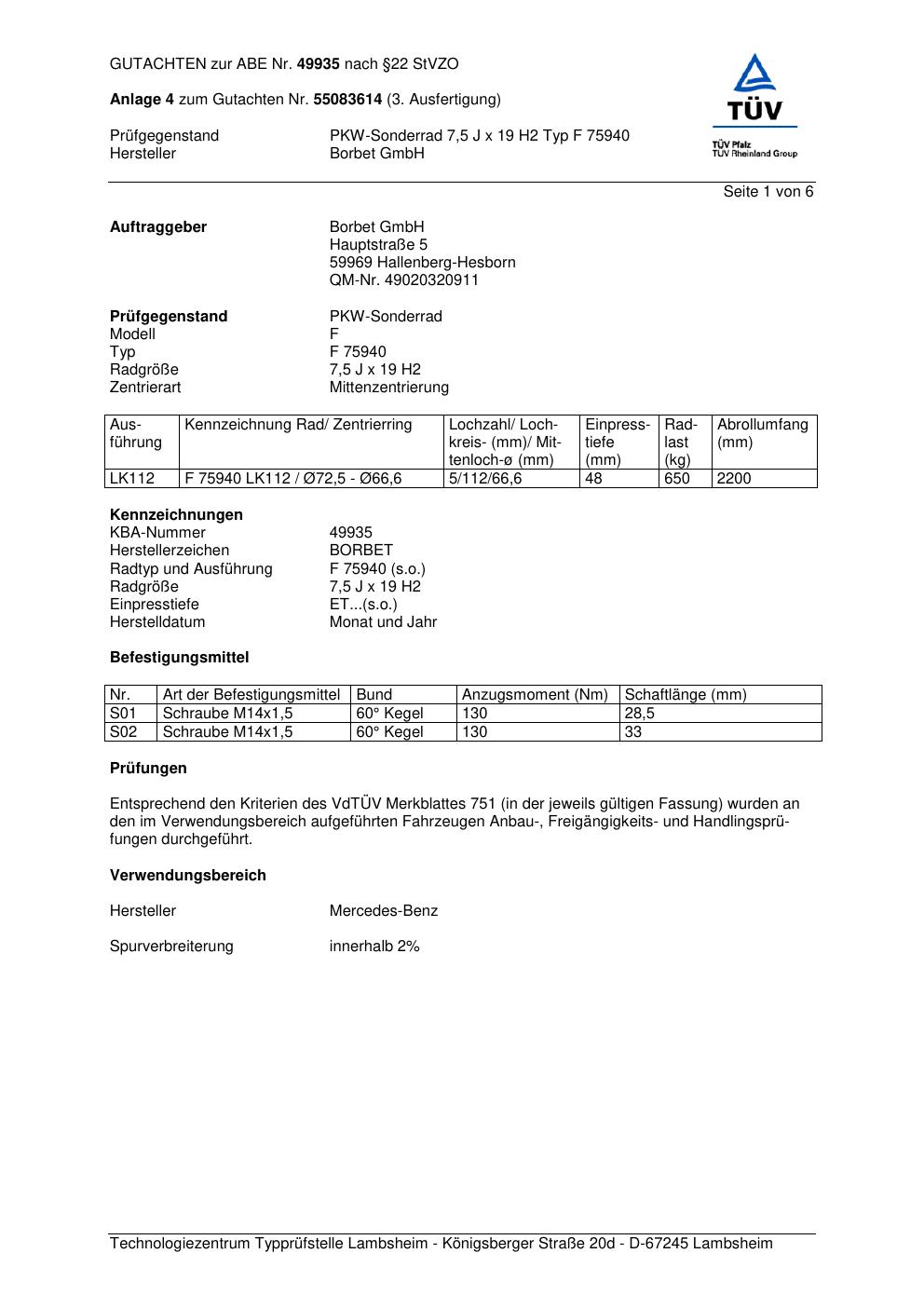 Dieses Gutachten (abe) bezieht sich auf die Alufelge Borbet F 75 940 in der Ausführung 7.5Jx19 ET 0, Mittenloch 0 mm (KBA 49935). Im PDF findest du typischerweise zulässige Reifengrößen, Auflagen/Anbauhinweise und – je nach Dokument – Hinweise zur Eintragung.