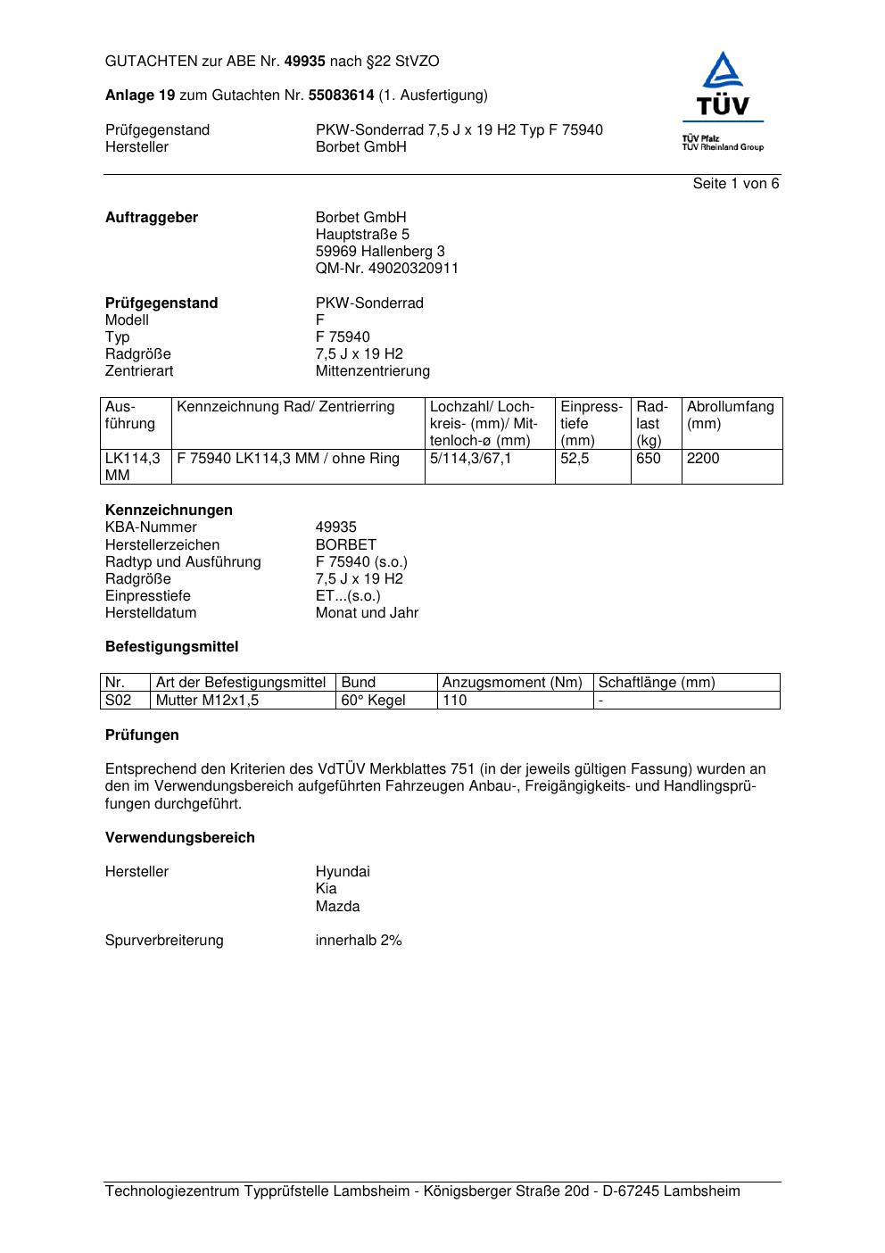 Dieses Gutachten (abe) bezieht sich auf die Alufelge Borbet F 75 940 in der Ausführung 7.5Jx19 ET 0, Mittenloch 0 mm (KBA 49935). Im PDF findest du typischerweise zulässige Reifengrößen, Auflagen/Anbauhinweise und – je nach Dokument – Hinweise zur Eintragung.