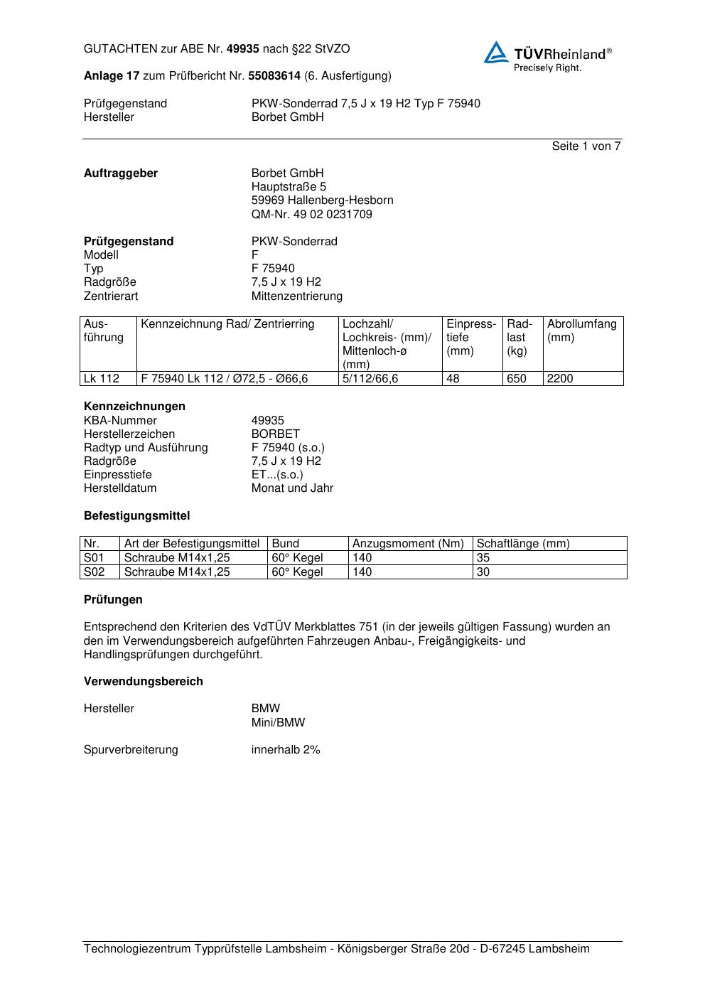 Dieses Gutachten (abe) bezieht sich auf die Alufelge Borbet F 75 940 in der Ausführung 7.5Jx19 ET 0, Mittenloch 0 mm (KBA 49935). Im PDF findest du typischerweise zulässige Reifengrößen, Auflagen/Anbauhinweise und – je nach Dokument – Hinweise zur Eintragung.