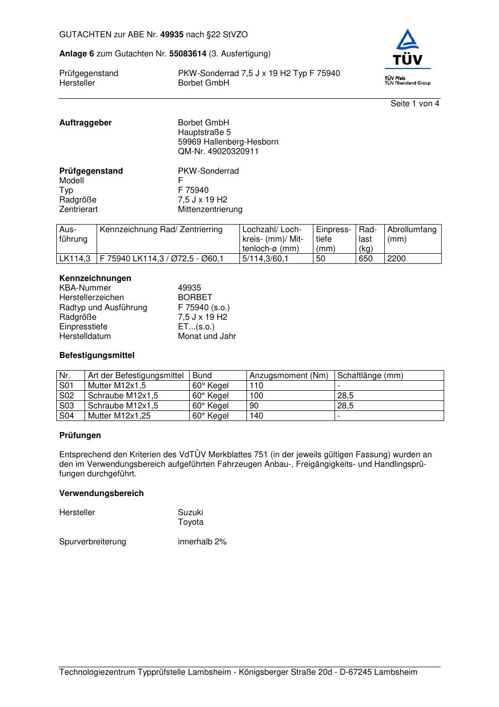 Dieses Gutachten (abe) bezieht sich auf die Alufelge Borbet F 75 940 in der Ausführung 7.5Jx19 ET 0, Mittenloch 0 mm (KBA 49935). Im PDF findest du typischerweise zulässige Reifengrößen, Auflagen/Anbauhinweise und – je nach Dokument – Hinweise zur Eintragung.
