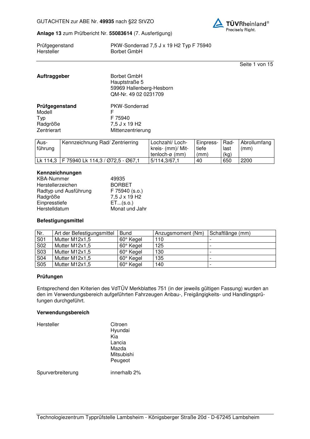 Dieses Gutachten (abe) bezieht sich auf die Alufelge Borbet F 75 940 in der Ausführung 7.5Jx19 ET 0, Mittenloch 0 mm (KBA 49935). Im PDF findest du typischerweise zulässige Reifengrößen, Auflagen/Anbauhinweise und – je nach Dokument – Hinweise zur Eintragung.