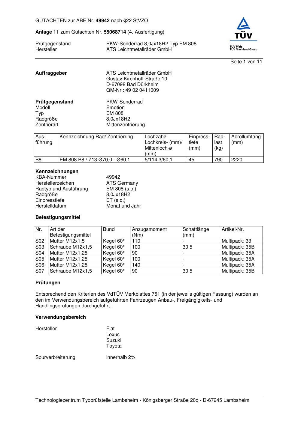 Dieses Gutachten (abe) bezieht sich auf die Alufelge ATS EM 808 in der Ausführung 8Jx18 ET 0, Mittenloch 0 mm (KBA 49942). Im PDF findest du typischerweise zulässige Reifengrößen, Auflagen/Anbauhinweise und – je nach Dokument – Hinweise zur Eintragung.