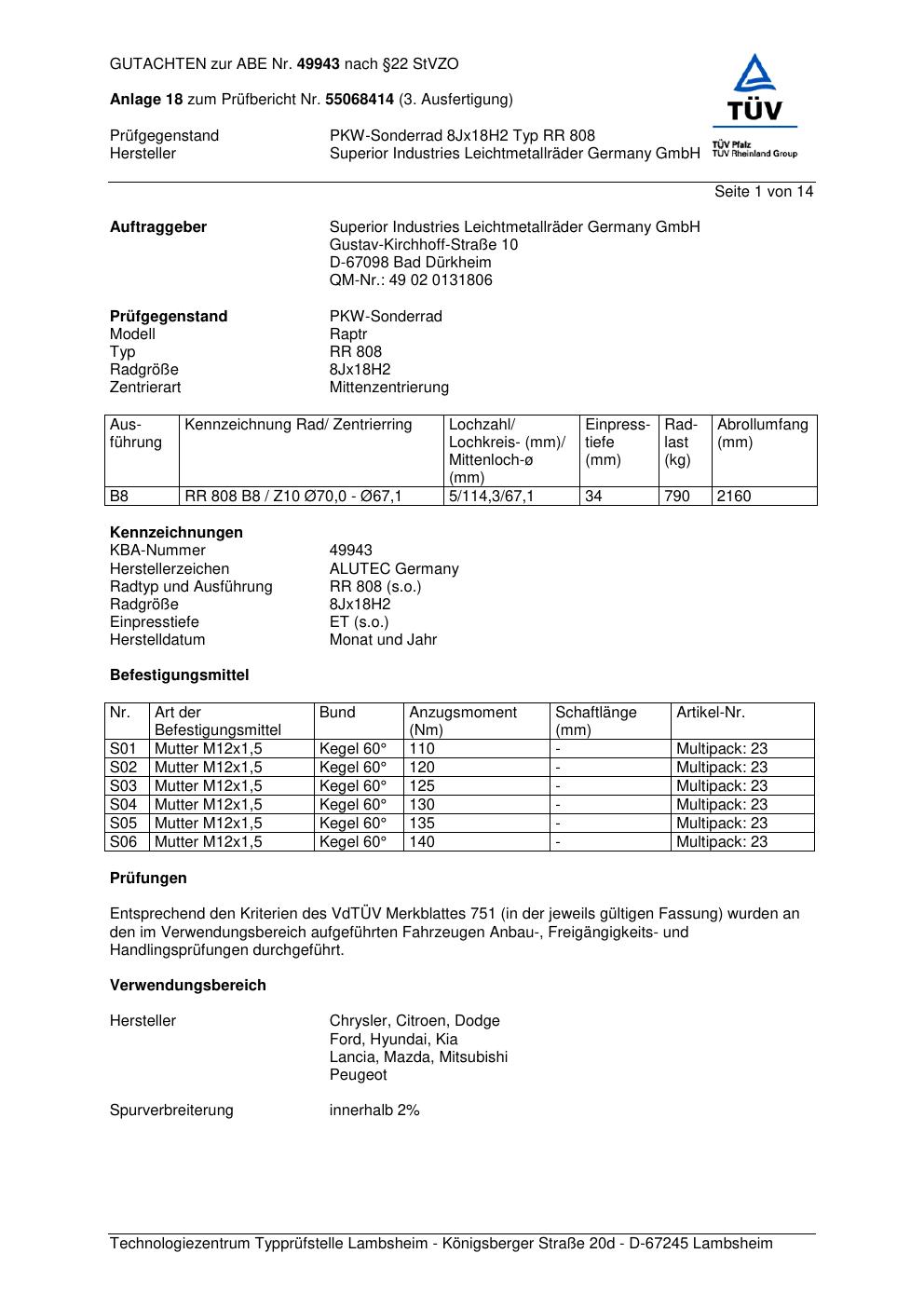 Dieses Gutachten (abe) bezieht sich auf die Alufelge ALUTEC RR 808 in der Ausführung 8Jx18 ET 0, Mittenloch 0 mm (KBA 49943). Im PDF findest du typischerweise zulässige Reifengrößen, Auflagen/Anbauhinweise und – je nach Dokument – Hinweise zur Eintragung.