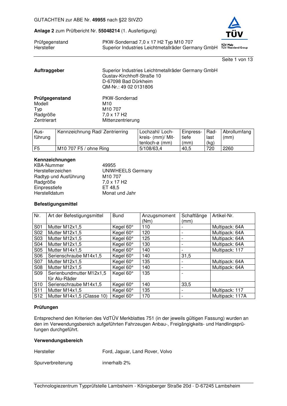 Dieses Gutachten (abe) bezieht sich auf die Alufelge Superior M10 70 7 in der Ausführung 7Jx17 ET 0, Mittenloch 0 mm (KBA 49955). Im PDF findest du typischerweise zulässige Reifengrößen, Auflagen/Anbauhinweise und – je nach Dokument – Hinweise zur Eintragung.