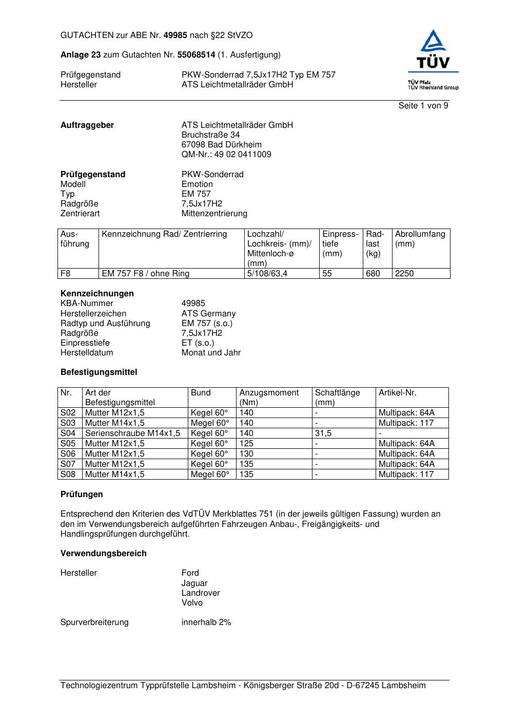 Dieses Gutachten (abe) bezieht sich auf die Alufelge ATS EM 757 in der Ausführung 7.5Jx17 ET 0, Mittenloch 0 mm (KBA 49985). Im PDF findest du typischerweise zulässige Reifengrößen, Auflagen/Anbauhinweise und – je nach Dokument – Hinweise zur Eintragung.