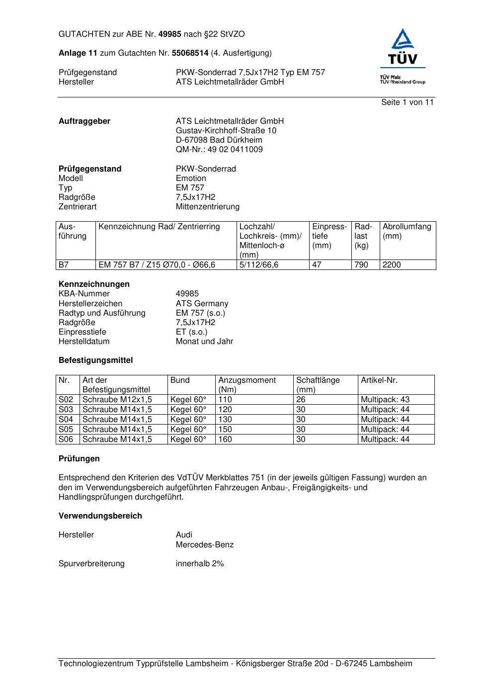 Dieses Gutachten (abe) bezieht sich auf die Alufelge ATS EM 757 in der Ausführung 7.5Jx17 ET 0, Mittenloch 0 mm (KBA 49985). Im PDF findest du typischerweise zulässige Reifengrößen, Auflagen/Anbauhinweise und – je nach Dokument – Hinweise zur Eintragung.
