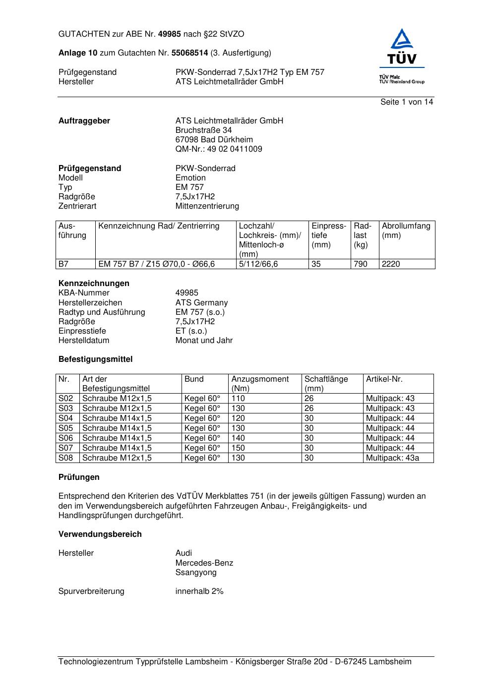 Dieses Gutachten (abe) bezieht sich auf die Alufelge ATS EM 757 in der Ausführung 7.5Jx17 ET 0, Mittenloch 0 mm (KBA 49985). Im PDF findest du typischerweise zulässige Reifengrößen, Auflagen/Anbauhinweise und – je nach Dokument – Hinweise zur Eintragung.