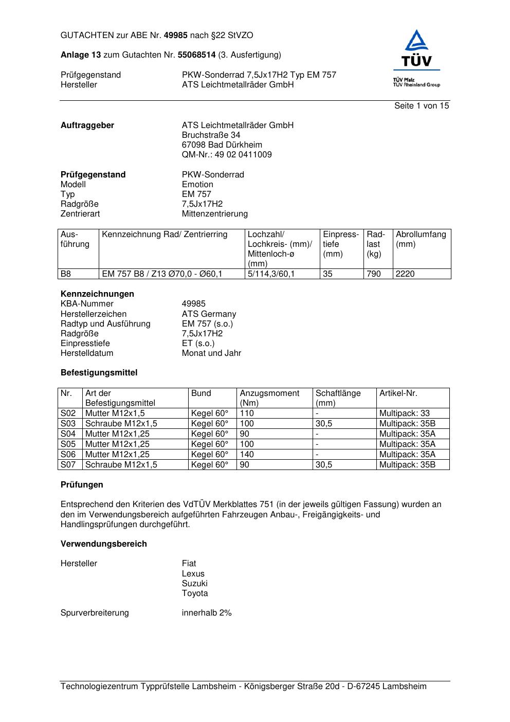 Dieses Gutachten (abe) bezieht sich auf die Alufelge ATS EM 757 in der Ausführung 7.5Jx17 ET 0, Mittenloch 0 mm (KBA 49985). Im PDF findest du typischerweise zulässige Reifengrößen, Auflagen/Anbauhinweise und – je nach Dokument – Hinweise zur Eintragung.