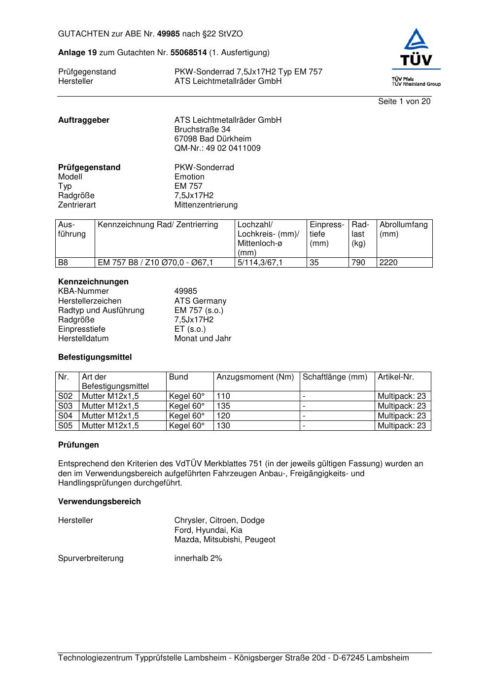 Dieses Gutachten (abe) bezieht sich auf die Alufelge ATS EM 757 in der Ausführung 7.5Jx17 ET 0, Mittenloch 0 mm (KBA 49985). Im PDF findest du typischerweise zulässige Reifengrößen, Auflagen/Anbauhinweise und – je nach Dokument – Hinweise zur Eintragung.
