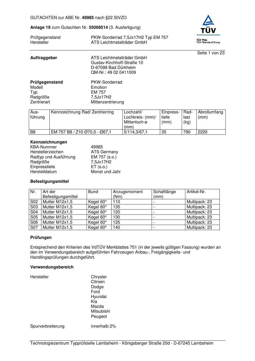 Dieses Gutachten (abe) bezieht sich auf die Alufelge ATS EM 757 in der Ausführung 7.5Jx17 ET 0, Mittenloch 0 mm (KBA 49985). Im PDF findest du typischerweise zulässige Reifengrößen, Auflagen/Anbauhinweise und – je nach Dokument – Hinweise zur Eintragung.