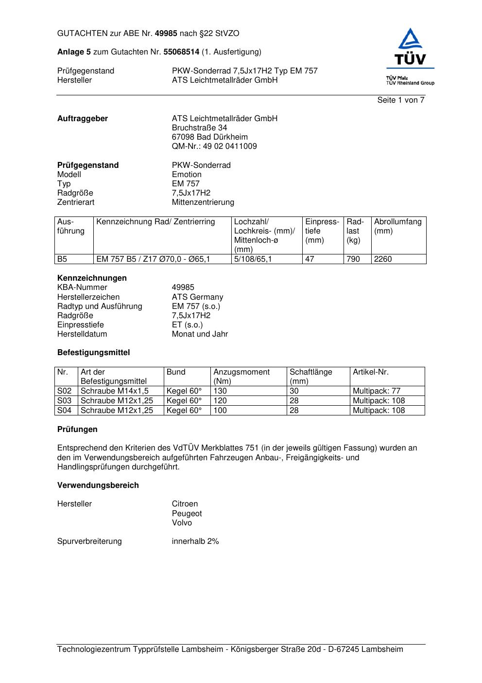 Dieses Gutachten (abe) bezieht sich auf die Alufelge ATS EM 757 in der Ausführung 7.5Jx17 ET 0, Mittenloch 0 mm (KBA 49985). Im PDF findest du typischerweise zulässige Reifengrößen, Auflagen/Anbauhinweise und – je nach Dokument – Hinweise zur Eintragung.