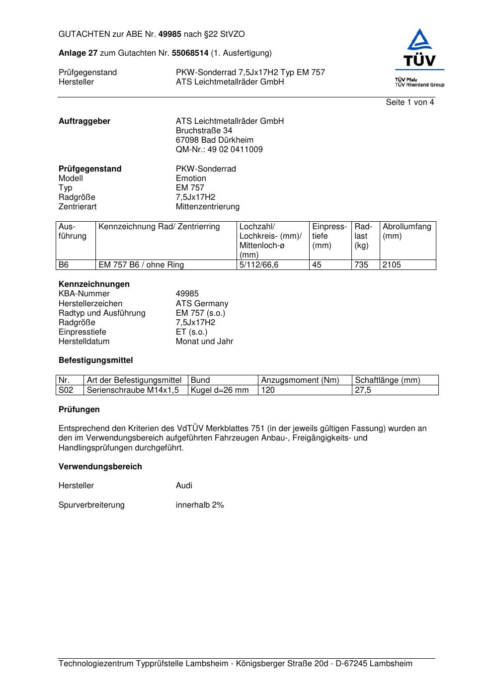 Dieses Gutachten (abe) bezieht sich auf die Alufelge ATS EM 757 in der Ausführung 7.5Jx17 ET 0, Mittenloch 0 mm (KBA 49985). Im PDF findest du typischerweise zulässige Reifengrößen, Auflagen/Anbauhinweise und – je nach Dokument – Hinweise zur Eintragung.