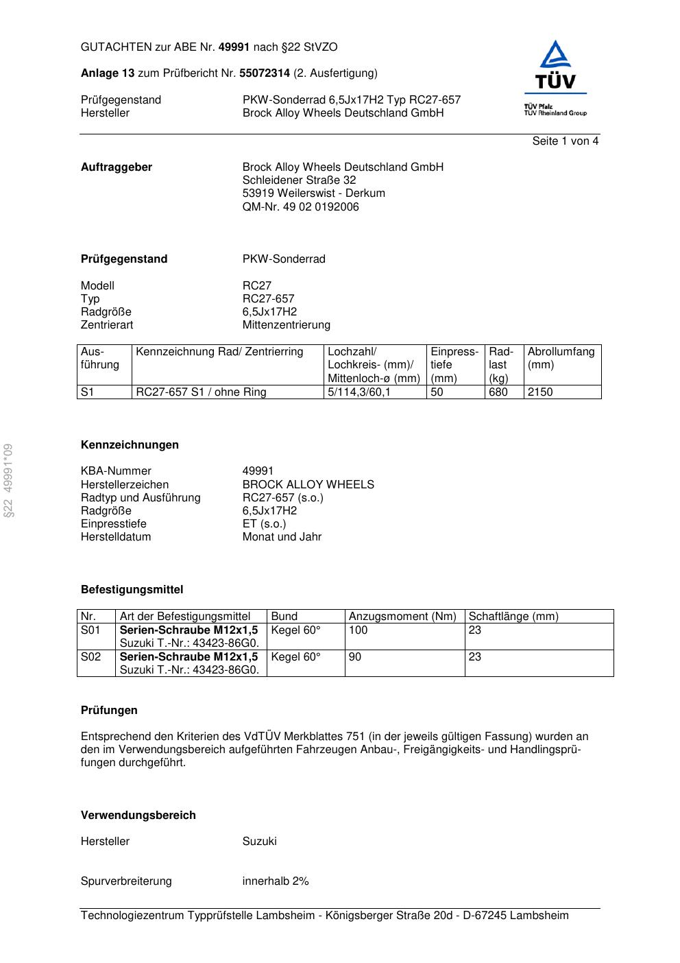 Dieses Gutachten (abe) bezieht sich auf die Alufelge Brock RC27-657 in der Ausführung 6.5Jx17 ET 0, Mittenloch 0 mm (KBA 49991). Im PDF findest du typischerweise zulässige Reifengrößen, Auflagen/Anbauhinweise und – je nach Dokument – Hinweise zur Eintragung.