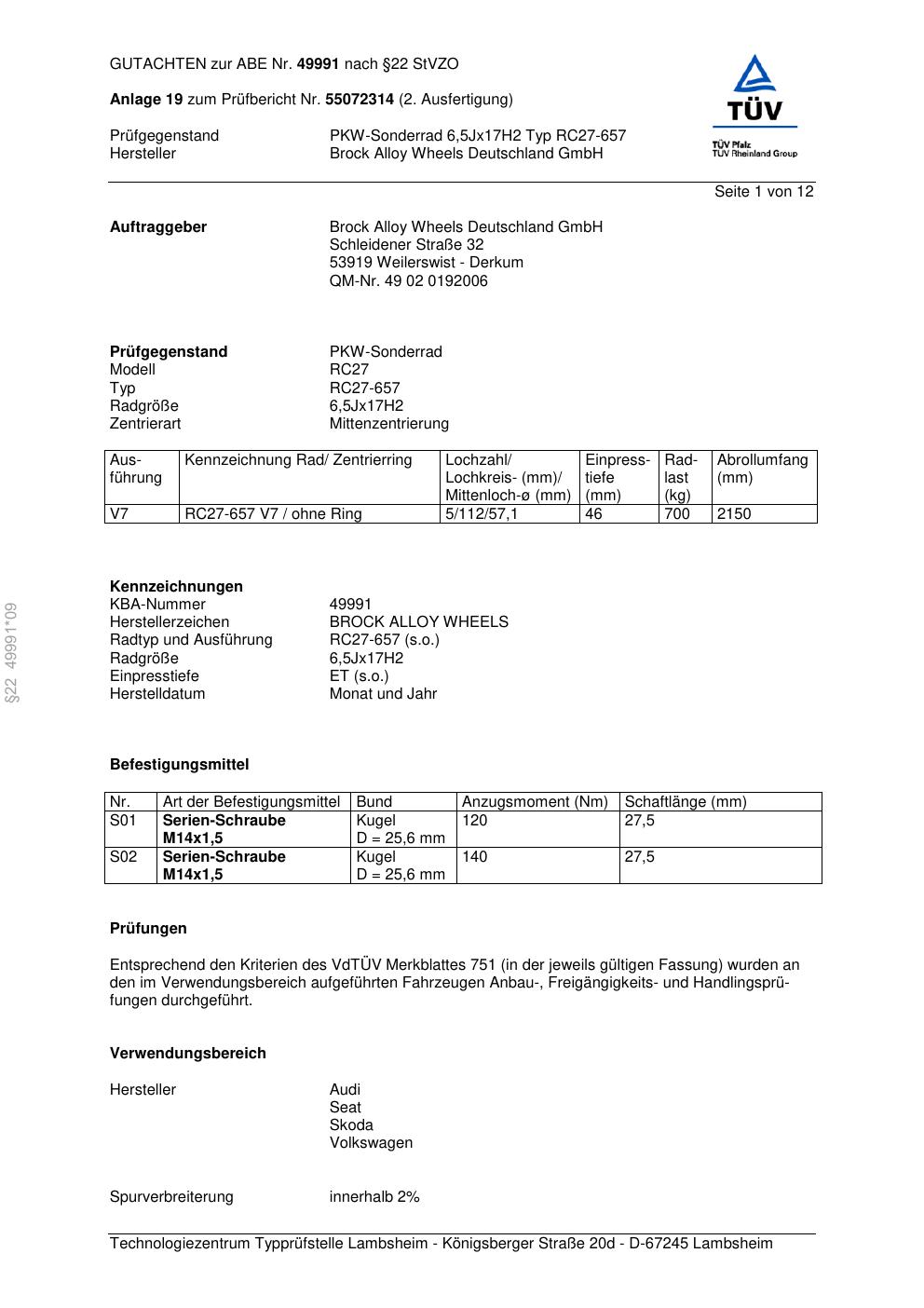Felgengutachten / abe für Alufelgen Brock RC27-657 (6.5Jx17 ET 0, Mittenloch 0 mm) mit KBA 49991 (Zertifikatsnummer 49991). Hier kostenlos als PDF herunterladen. Der Download-Link ist 24 Stunden gültig und kann bis zu zwei Mal verwendet werden.