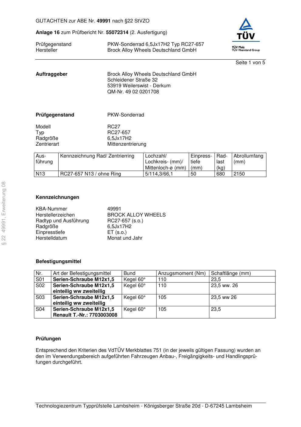 Felgengutachten / abe für Alufelgen Brock RC27-657 (6.5Jx17 ET 0, Mittenloch 0 mm) mit KBA 49991 (Zertifikatsnummer 49991). Hier kostenlos als PDF herunterladen. Der Download-Link ist 24 Stunden gültig und kann bis zu zwei Mal verwendet werden.