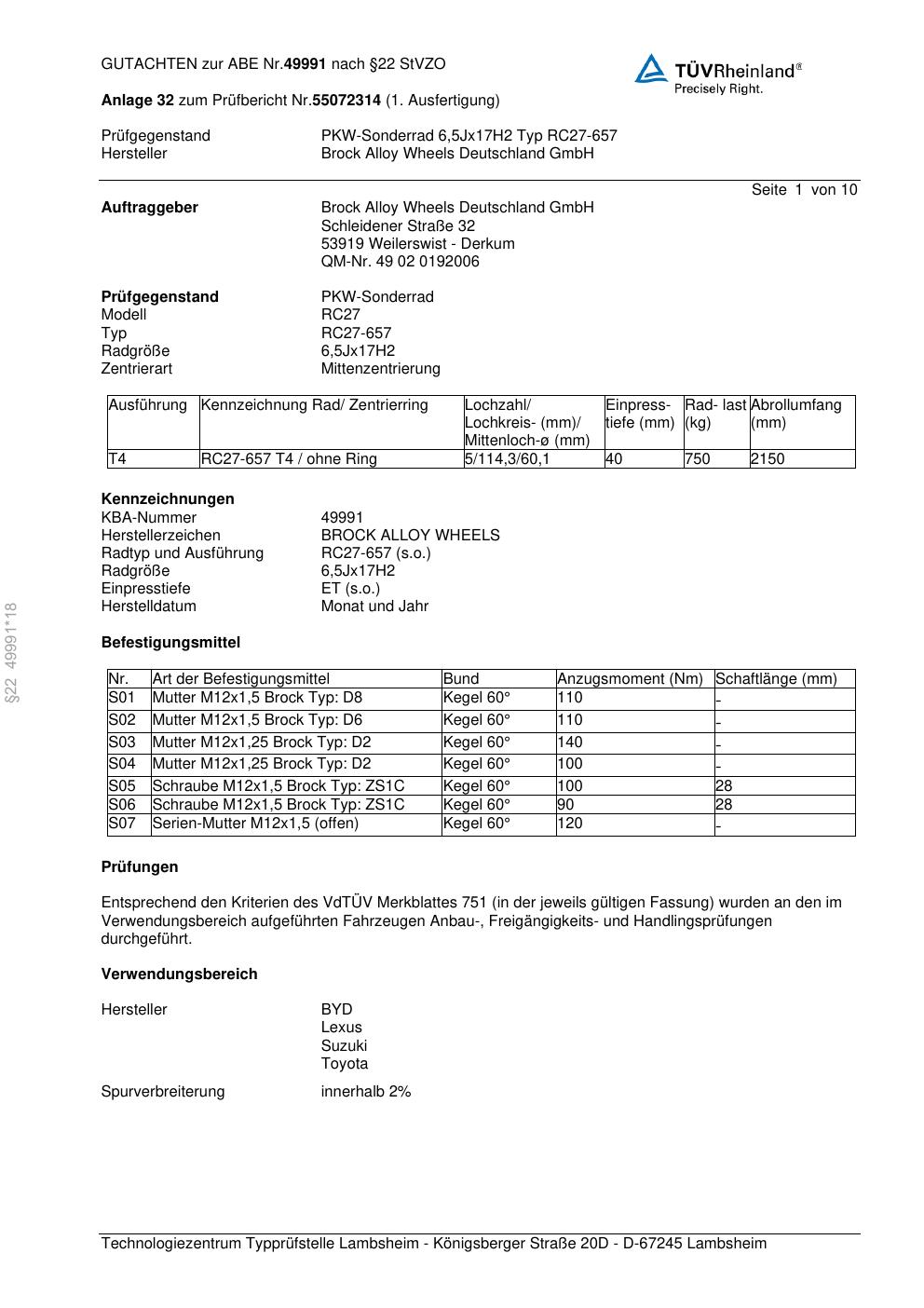 Felgengutachten / abe für Alufelgen Brock RC27-657 (6.5Jx17 ET 0, Mittenloch 0 mm) mit KBA 49991 (Zertifikatsnummer 49991). Hier kostenlos als PDF herunterladen. Der Download-Link ist 24 Stunden gültig und kann bis zu zwei Mal verwendet werden.