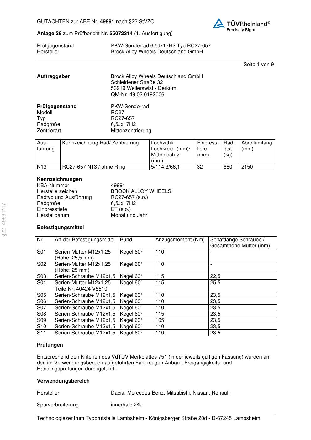 Dieses Gutachten (abe) bezieht sich auf die Alufelge Brock RC27-657 in der Ausführung 6.5Jx17 ET 0, Mittenloch 0 mm (KBA 49991). Im PDF findest du typischerweise zulässige Reifengrößen, Auflagen/Anbauhinweise und – je nach Dokument – Hinweise zur Eintragung.