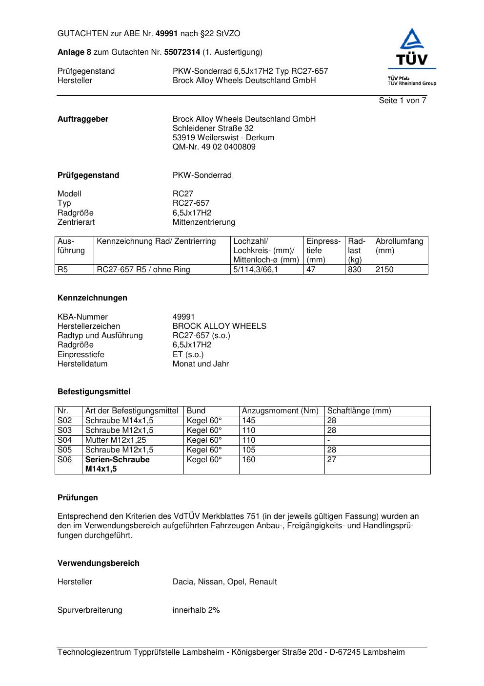 Dieses Gutachten (abe) bezieht sich auf die Alufelge Brock RC27-657 in der Ausführung 6.5Jx17 ET 0, Mittenloch 0 mm (KBA 49991). Im PDF findest du typischerweise zulässige Reifengrößen, Auflagen/Anbauhinweise und – je nach Dokument – Hinweise zur Eintragung.