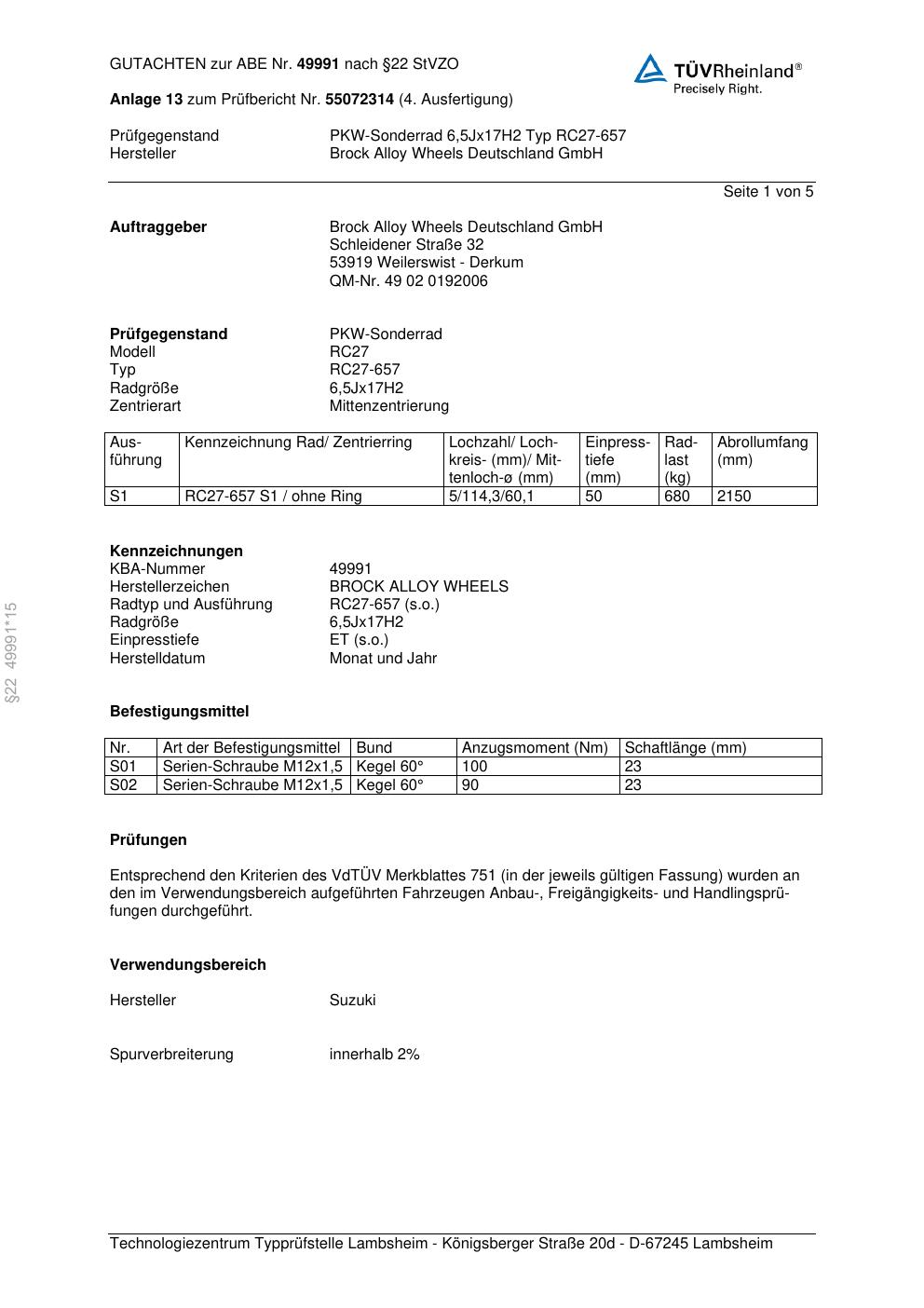 Felgengutachten / abe für Alufelgen Brock RC27-657 (6.5Jx17 ET 0, Mittenloch 0 mm) mit KBA 49991 (Zertifikatsnummer 49991). Hier kostenlos als PDF herunterladen. Der Download-Link ist 24 Stunden gültig und kann bis zu zwei Mal verwendet werden.