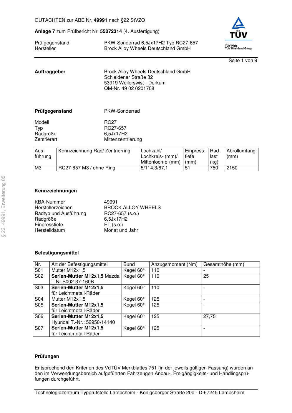 Dieses Gutachten (abe) bezieht sich auf die Alufelge Brock RC27-657 in der Ausführung 6.5Jx17 ET 0, Mittenloch 0 mm (KBA 49991). Im PDF findest du typischerweise zulässige Reifengrößen, Auflagen/Anbauhinweise und – je nach Dokument – Hinweise zur Eintragung.