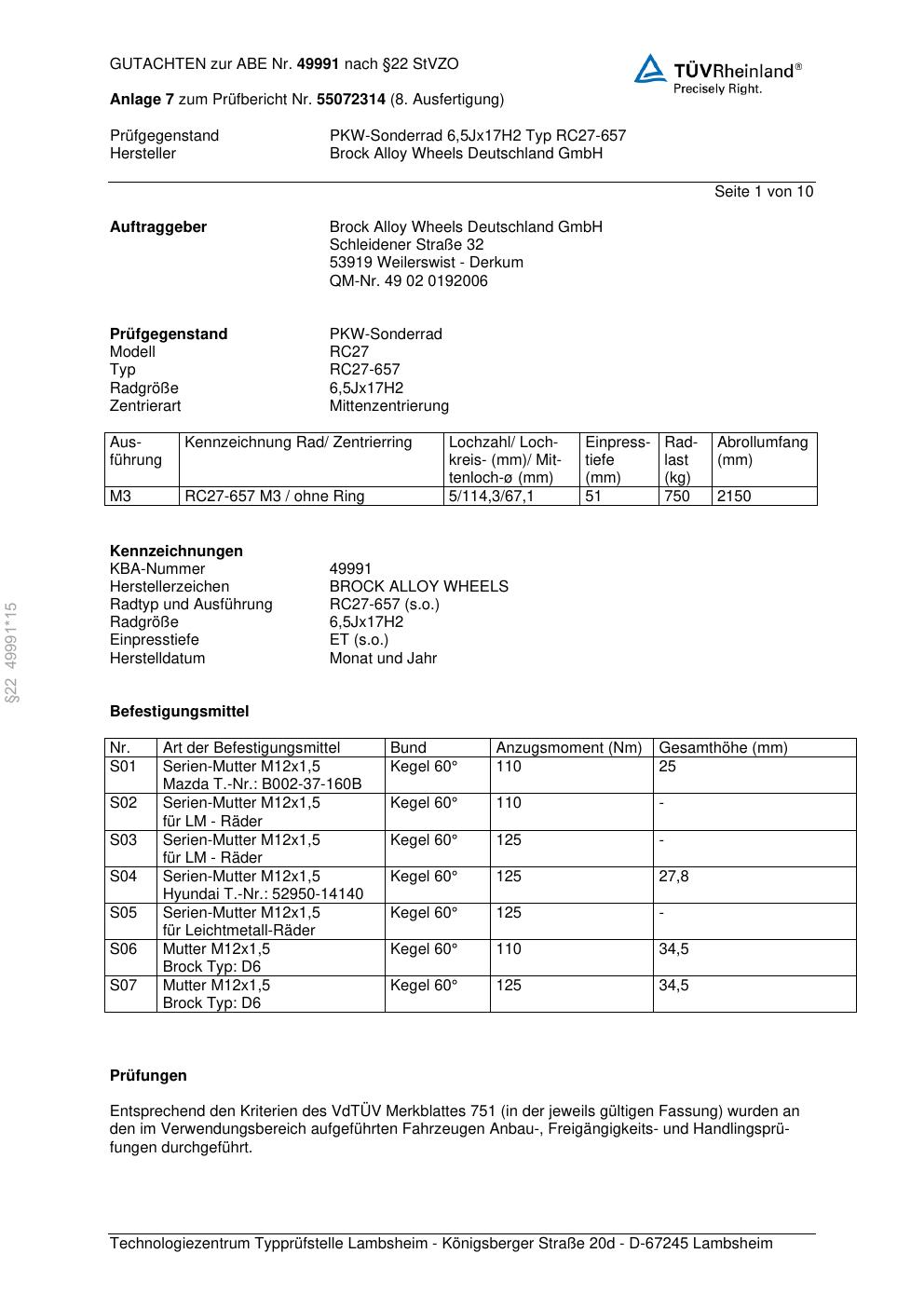 Dieses Gutachten (abe) bezieht sich auf die Alufelge Brock RC27-657 in der Ausführung 6.5Jx17 ET 0, Mittenloch 0 mm (KBA 49991). Im PDF findest du typischerweise zulässige Reifengrößen, Auflagen/Anbauhinweise und – je nach Dokument – Hinweise zur Eintragung.
