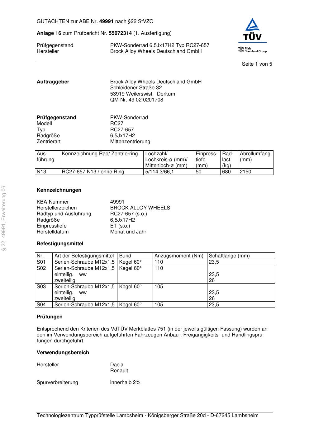 Felgengutachten / abe für Alufelgen Brock RC27-657 (6.5Jx17 ET 0, Mittenloch 0 mm) mit KBA 49991 (Zertifikatsnummer 49991). Hier kostenlos als PDF herunterladen. Der Download-Link ist 24 Stunden gültig und kann bis zu zwei Mal verwendet werden.
