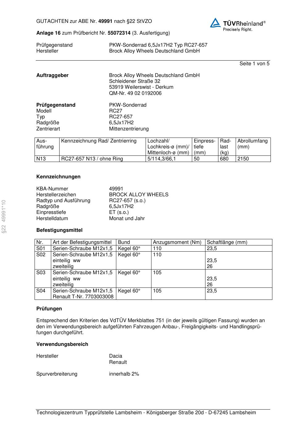 Dieses Gutachten (abe) bezieht sich auf die Alufelge Brock RC27-657 in der Ausführung 6.5Jx17 ET 0, Mittenloch 0 mm (KBA 49991). Im PDF findest du typischerweise zulässige Reifengrößen, Auflagen/Anbauhinweise und – je nach Dokument – Hinweise zur Eintragung.