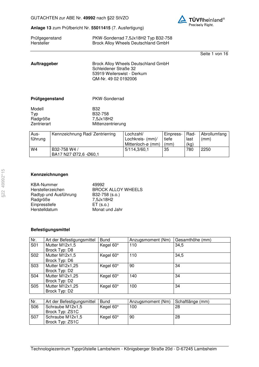 Dieses Gutachten (abe) bezieht sich auf die Alufelge Brock B32-758 in der Ausführung 7.5Jx18 ET 0, Mittenloch 0 mm (KBA 49992). Im PDF findest du typischerweise zulässige Reifengrößen, Auflagen/Anbauhinweise und – je nach Dokument – Hinweise zur Eintragung.